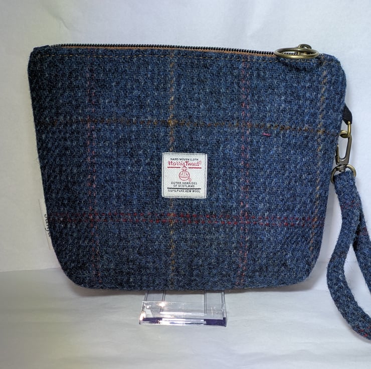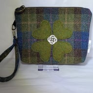Harris Tweed purse with wristlet strap, polyester / cotton lining with internal zip pocket. Co-ordinating colour heart applique on the front with Celtic knot style button.