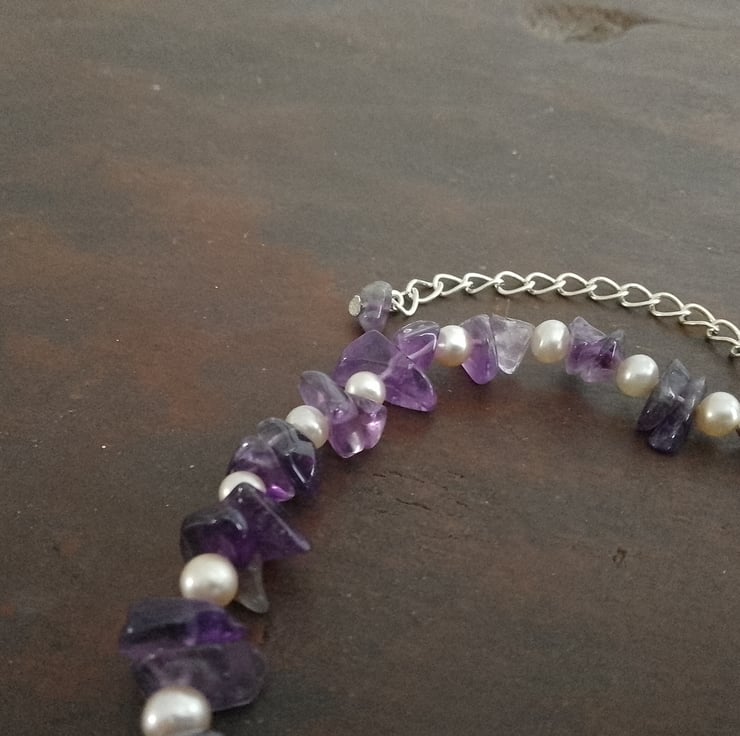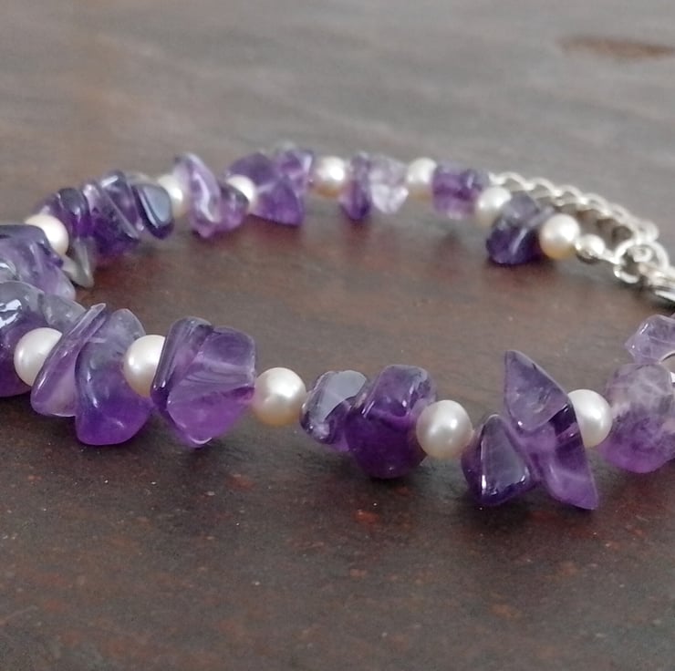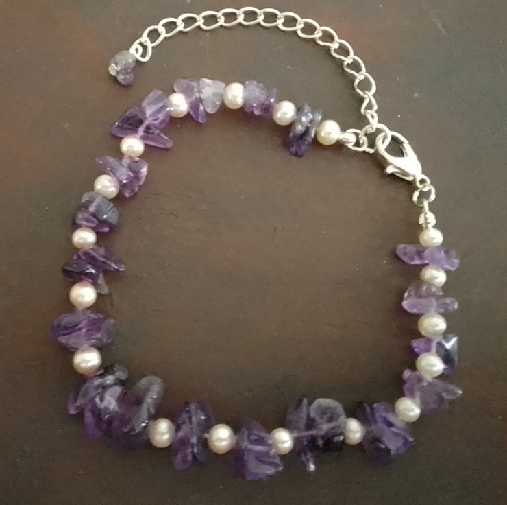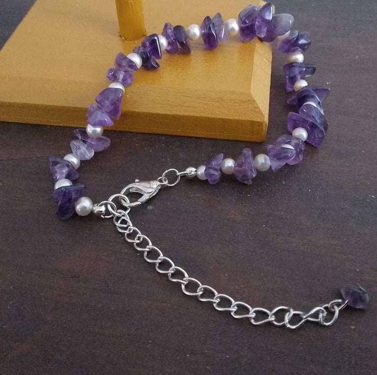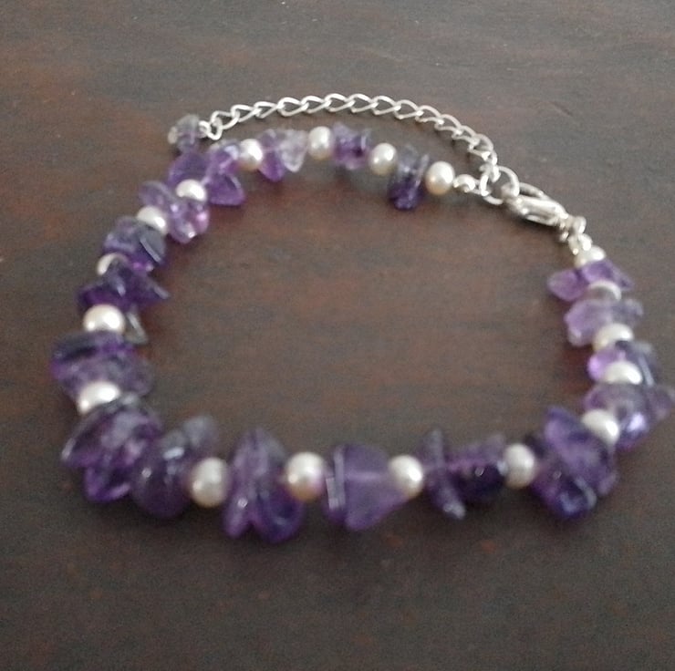 This handmade bracelet is made using amethyst chips combined with small ivory pearl beads. The combination provides an elegant look suitable for most occasions.