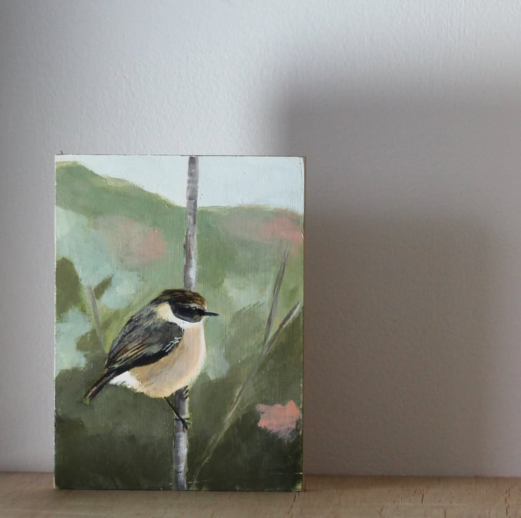 This is an original painting of a stonechat on reclaimed plywood and is inspired by one of my own photographs. It has been painted in acrylics and sealed with a thin protective coat of varnish.