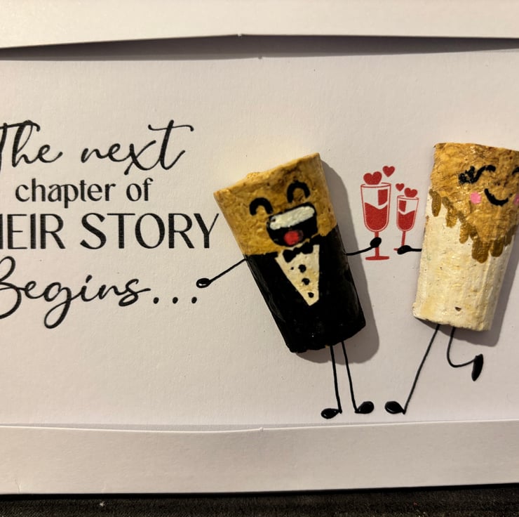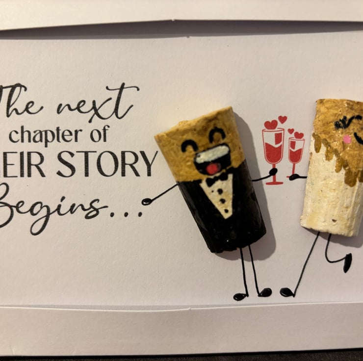 Handmade cork bride and groom card .” Individually created using real cork and hand painted details, making each card completely unique. Blank inside and supplied with envelope.