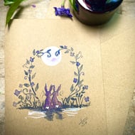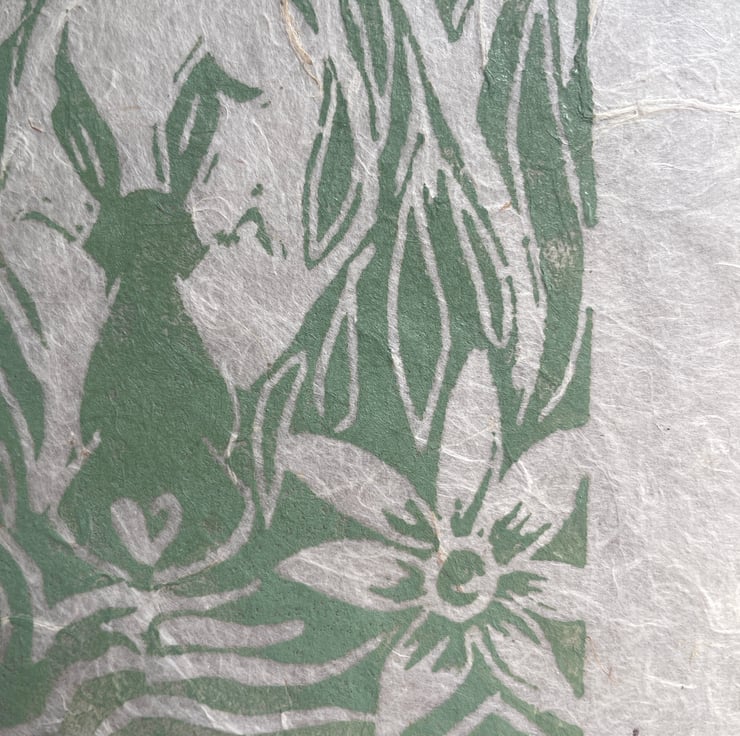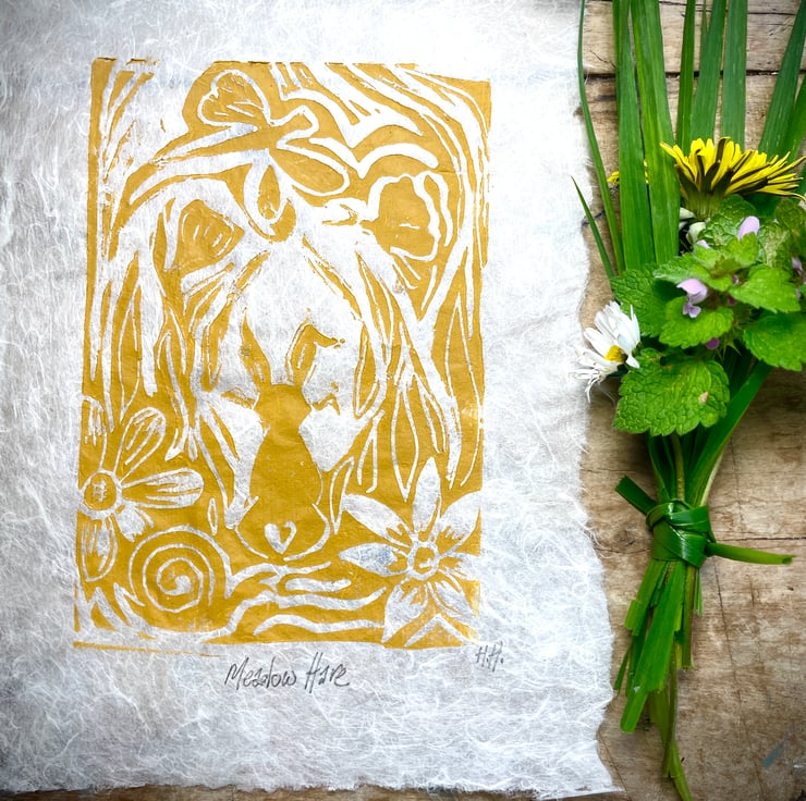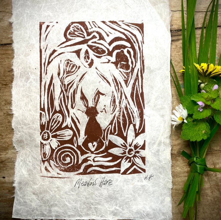 New! 'Meadow Hare' Signed, open edition of original design linocut print. Hand printed onto handmade Nepalese Lotka paper. A5 size. 4 colours available. Only from Honeysuckle Harebell.