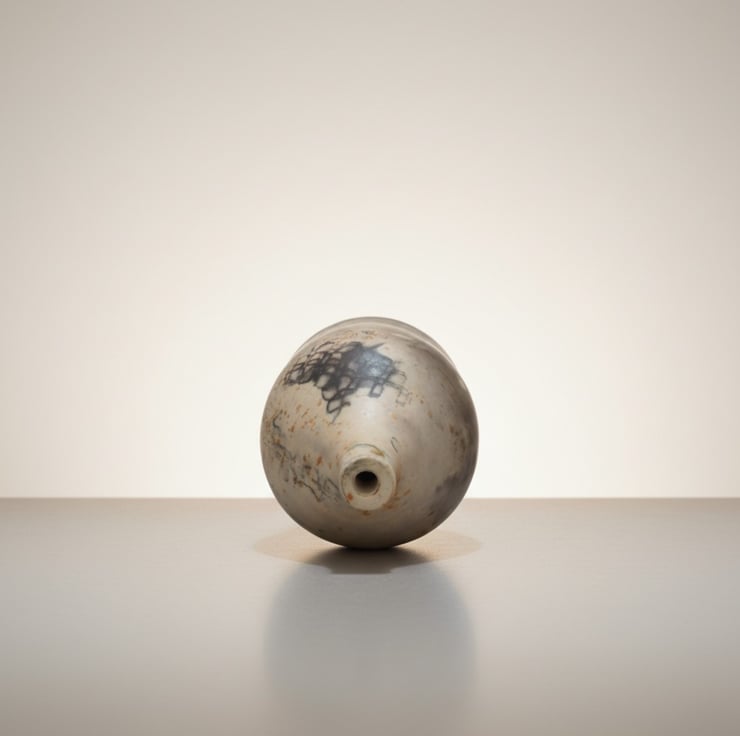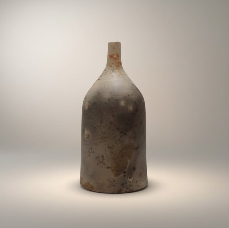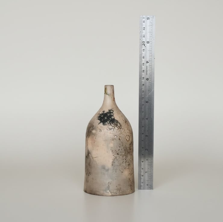 This is a slender saggar fired, bottle, wheel thrown in a white clay, burnished to give it a smooth polished surface. This is a classic bottle shape, with beautiful markings. The colours are subtle and understated, so that the markings stand out. This is not for someone looking for loud and brash, this is anything but.