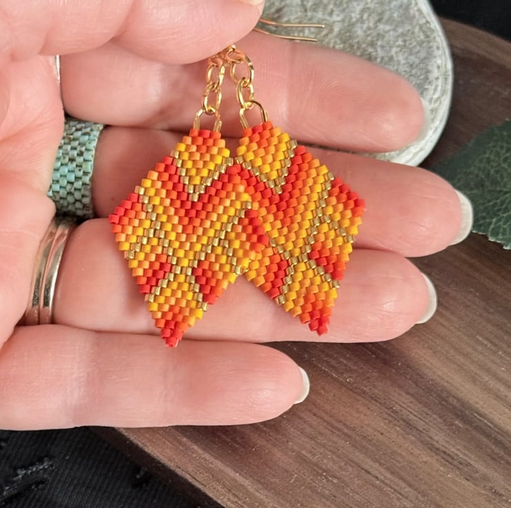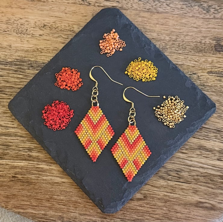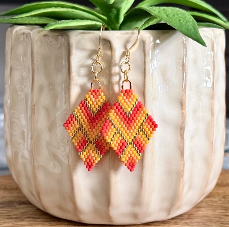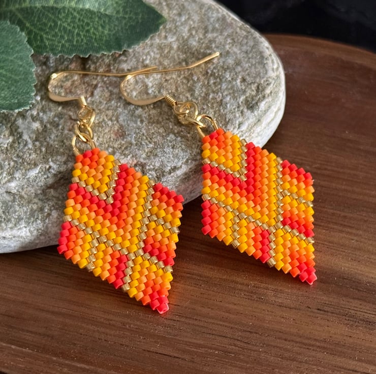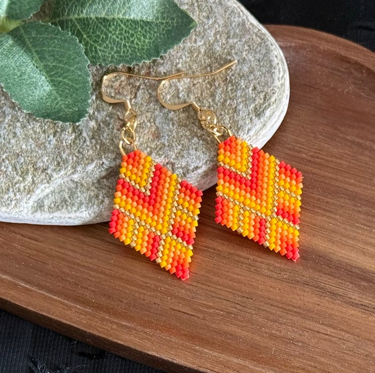 These are very colourful handmade earrings in vivid colours. They are made with Japanese Miyuki beads in red, orange and gold tones. Some of the beads have a matt finish giving them even more of a luminous look to the colours.