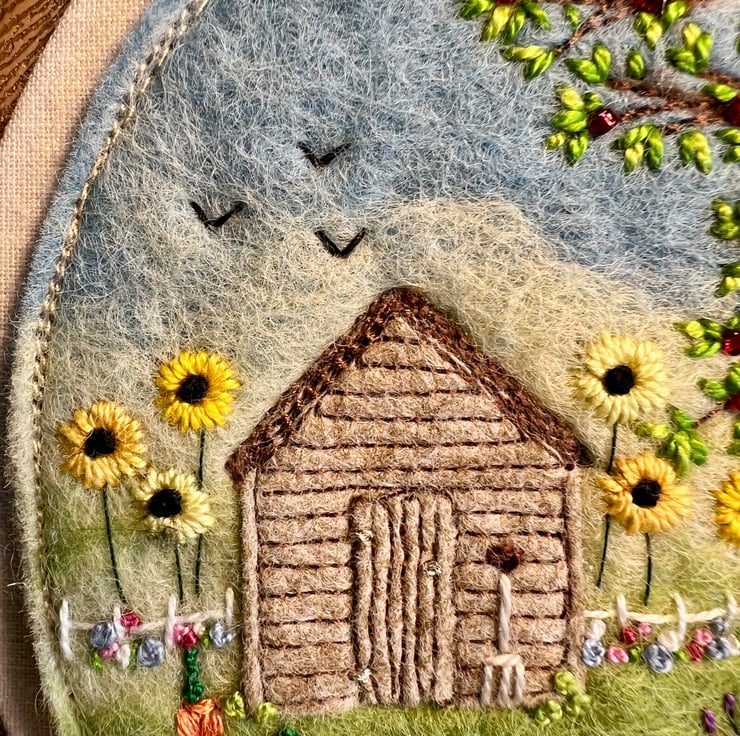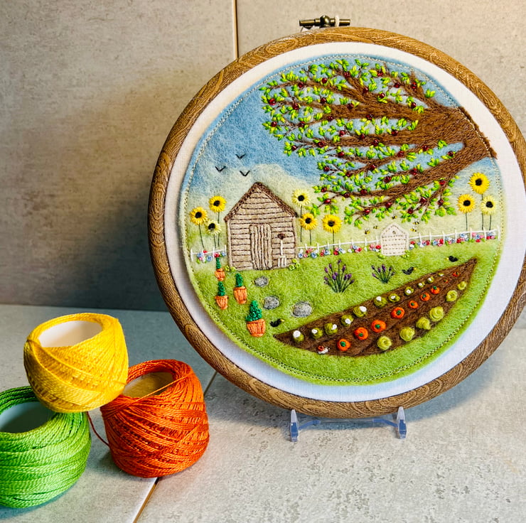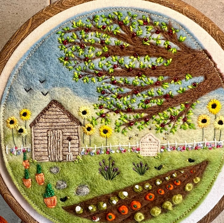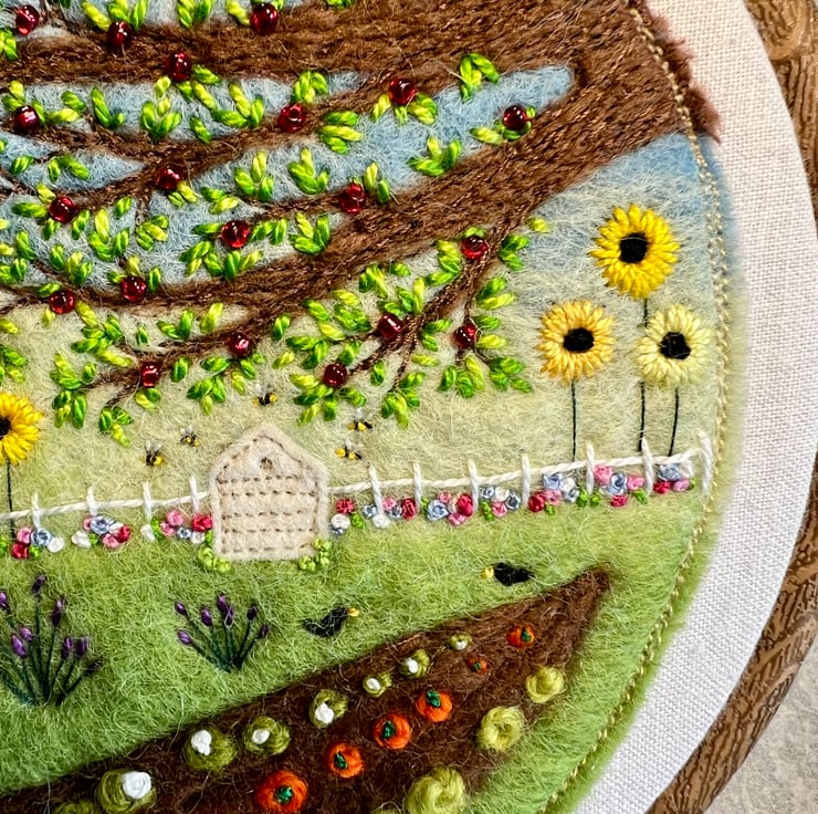 Wet felted background with needle felting, machine and hand embroidered garden with vegetable patch, bee hive and apple tree