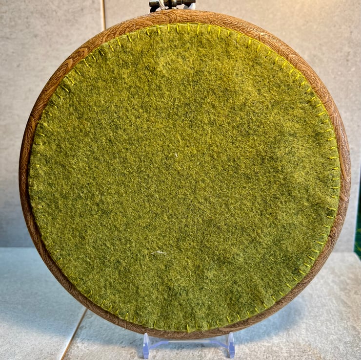 Mounted on wood effect flexible hoop, can be hung or displayed on plate stand.