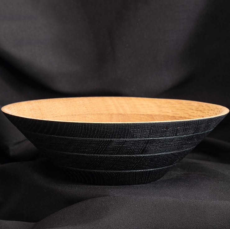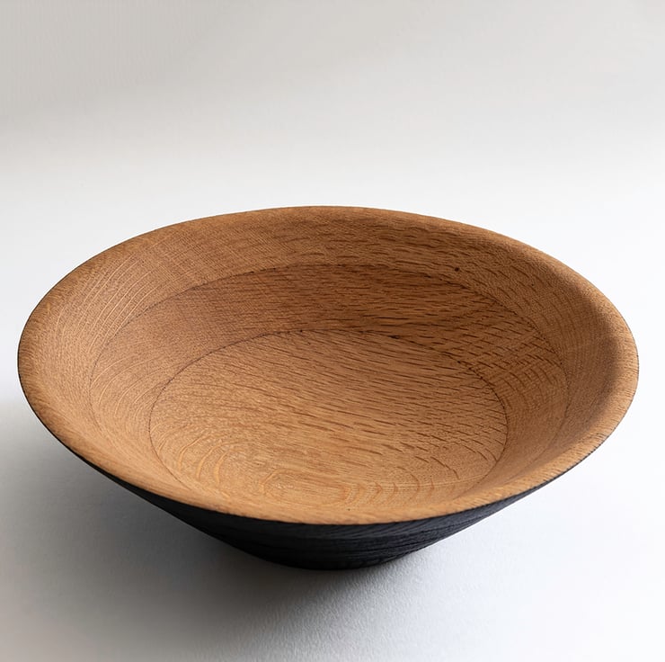 Recycled oak bowl made from wood salvaged from an old oak bookcase, finished in Shou Sugi Ban (or yakisugi) a traditional Japanese method of preserving wood by charring its surface with fire, creating a durable, fire-resistant, and insect-repellent material.