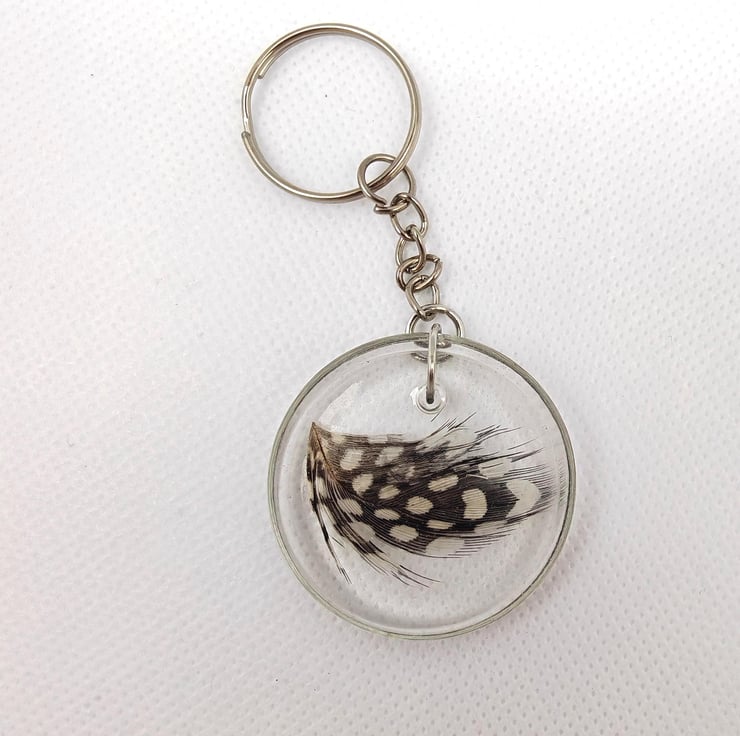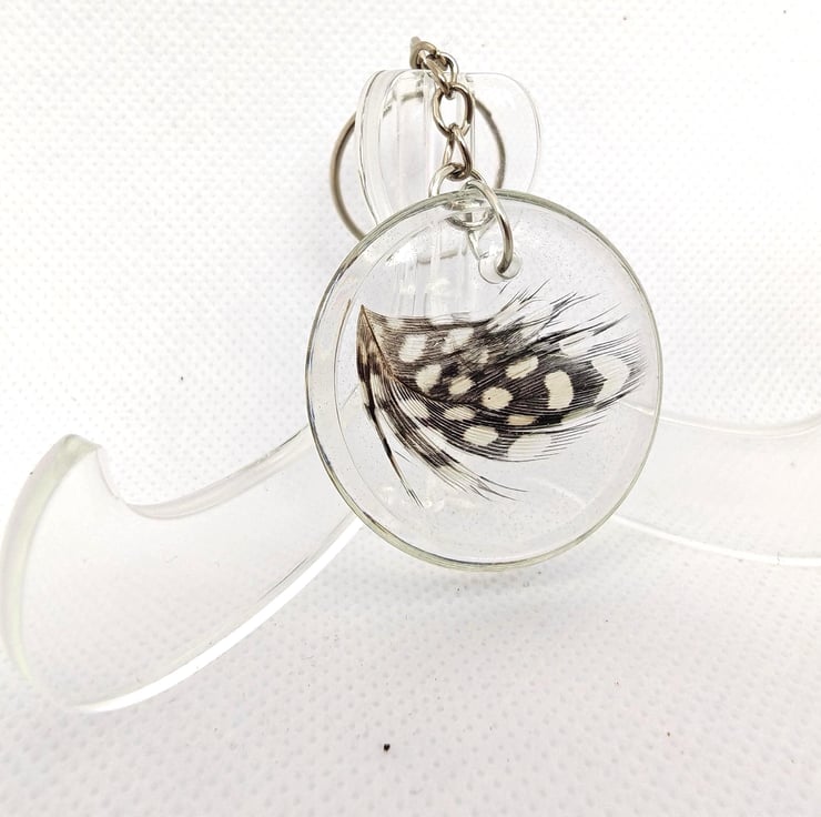 Handmade keychain with a real guinea fowl feather embedded in clear resin. Lightweight and unique, this nature- inspired piece brings a touch of the wild to your everyday. Perfect as a boho accessory, gift for nature lovers, or a little personal charm.