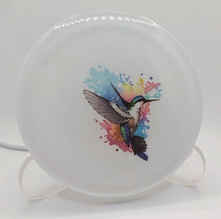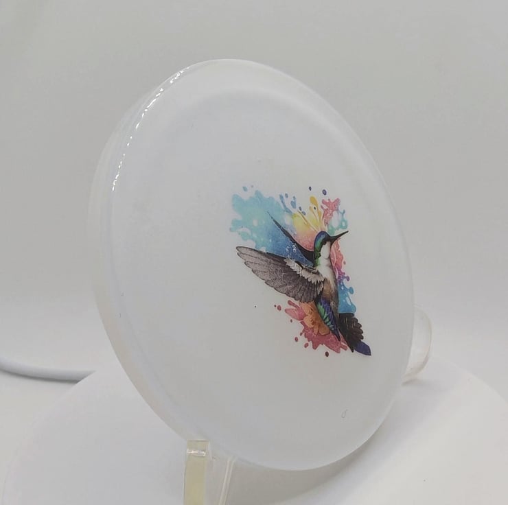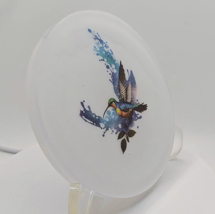 Two handmade resin coasters featuring a beautiful hummingbird design in vibrant colours.