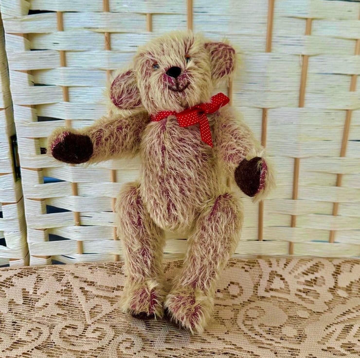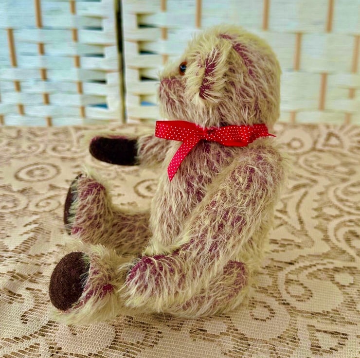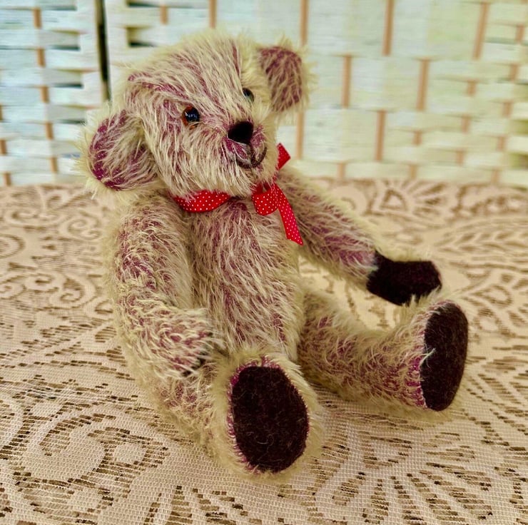 Justin is a playful Bear made from 12mm Gold on Raspberry Sparse Mohair fabric, with 100% Wool Felt pads and paws.