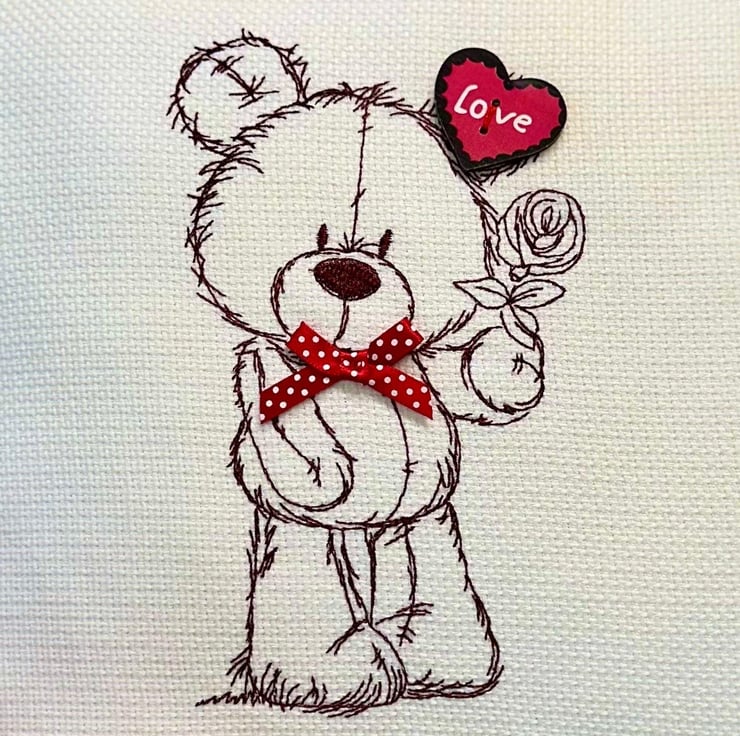 Handmade in a Light Cream fabric, machine embroidered with a standing Bear in Brown thread, decorated with a Red spot ribbon bow and Red Love wooden button heart in ear.