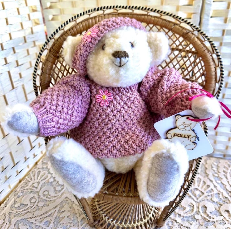 Polly: 33cm (13") is a sweet Bear made from Cream soft curl faux fur fabric, with 100% wool felt pads and paws.