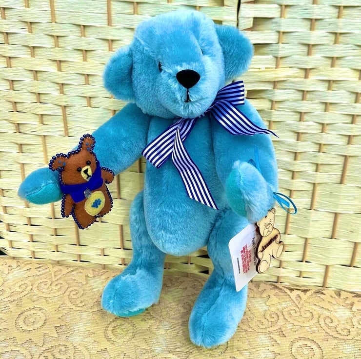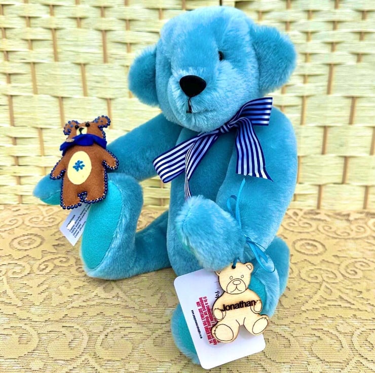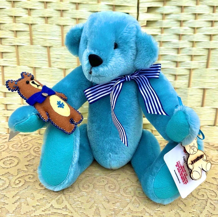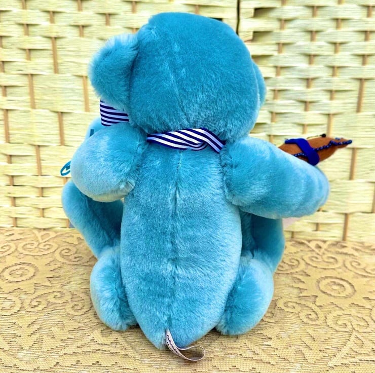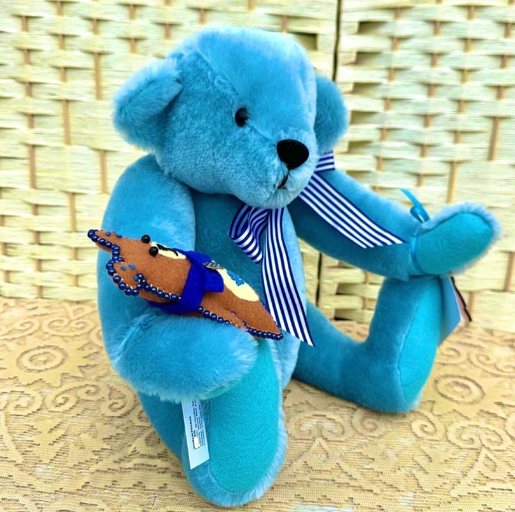 He’s wearing a U.K. Berrisford Blue stripe ribbon round his neck tied in a bow, and has his very own beaded felt bear.