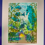 A set of four hand painted greeting cards featuring seahorses, shells ,lobster and crab .