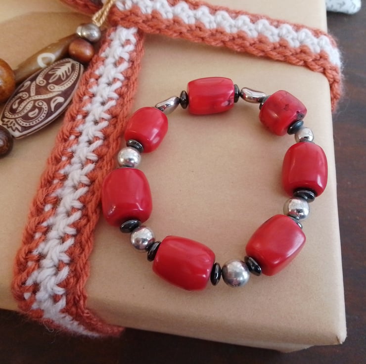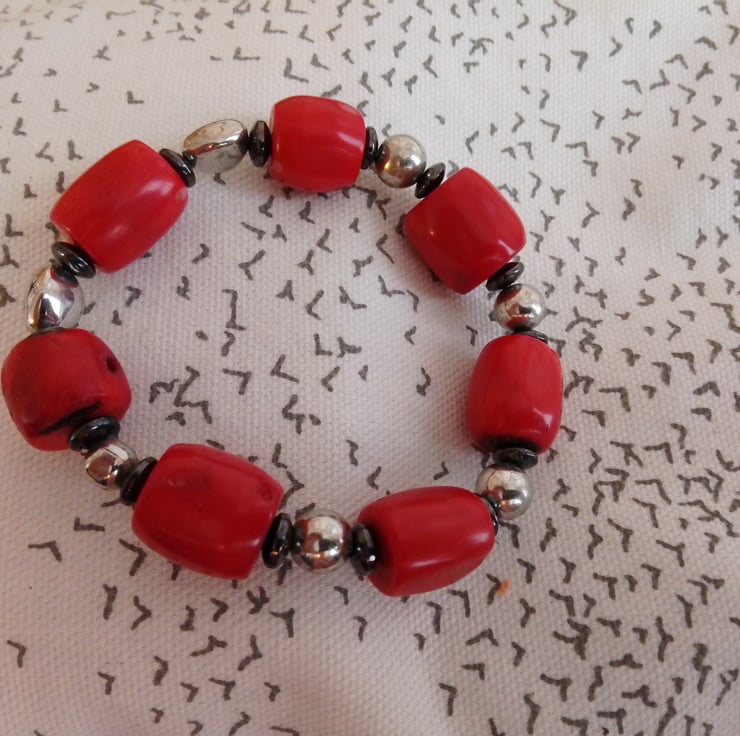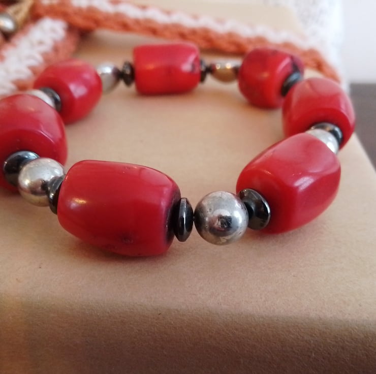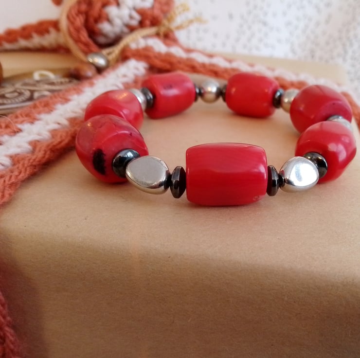 This handmade bracelet is made using a selection of resin, stone and haematite beads. The unique bead combination makes for a versatile and distinctive item.