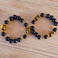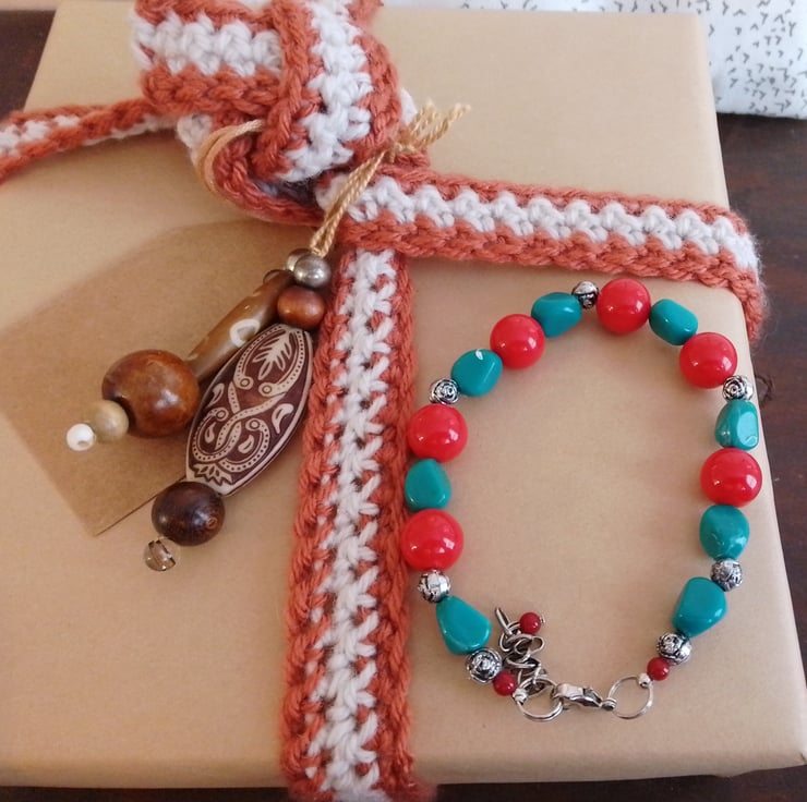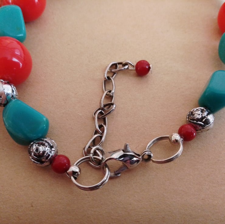This handmade bracelet is made using a combination of resin and metal beads. The distinctive blue, red and silver colourway makes for a versatile and stylish piece of jewellery.