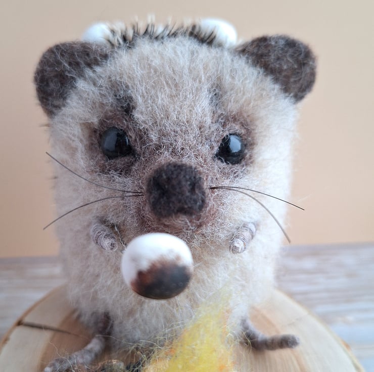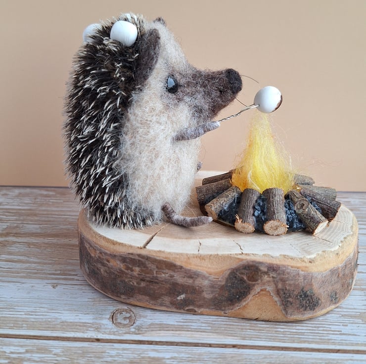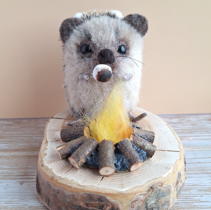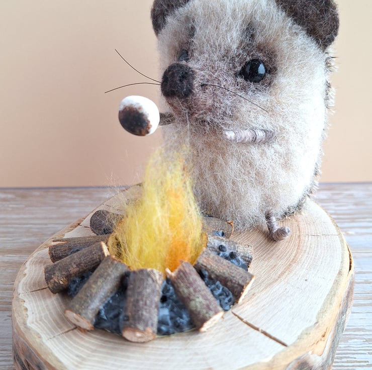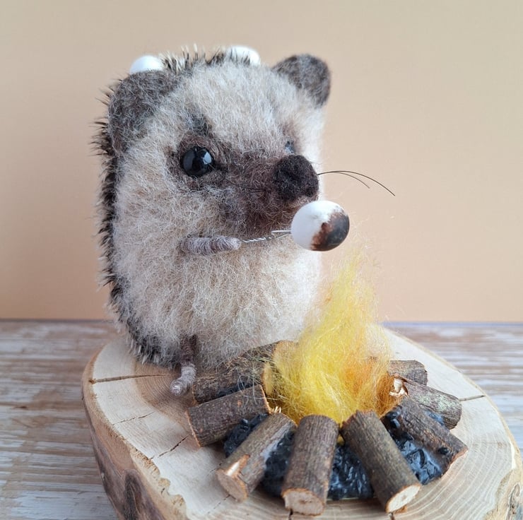 This little Hedgie is handmade from soft carded wool, and mohair fabric. In his paw he holds a tiny toasting fork to hold a squidgy Marshmallow up to the campfire. He has tiny glass eyes, and spare Marshmallows kept safely on this prickly spines.