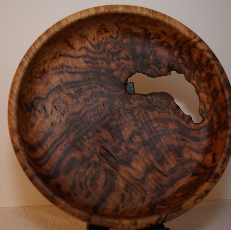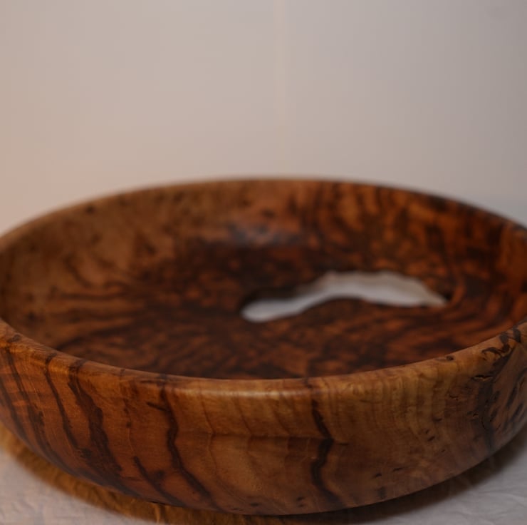 This piece is from a large storm-felled chestnut tree. It is a medium toned brown with dark streaks. The bowl was twice-turned on a wood lathe in a way that shows off the grain in the best way. This bowl would make a great display piece or could hold decorative items, but may not be great for soup!