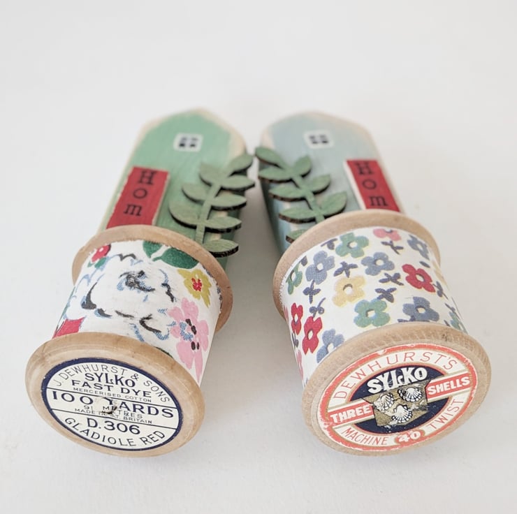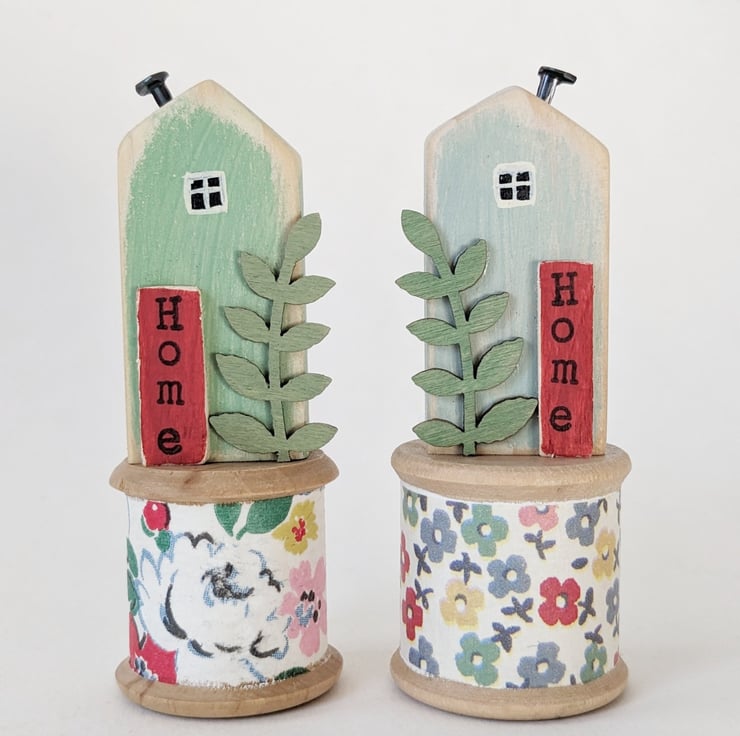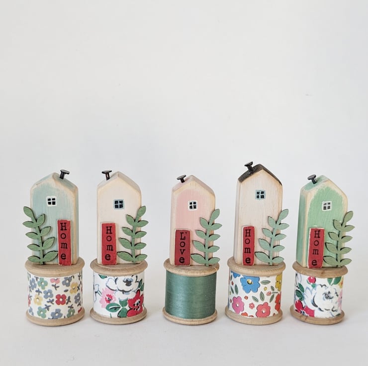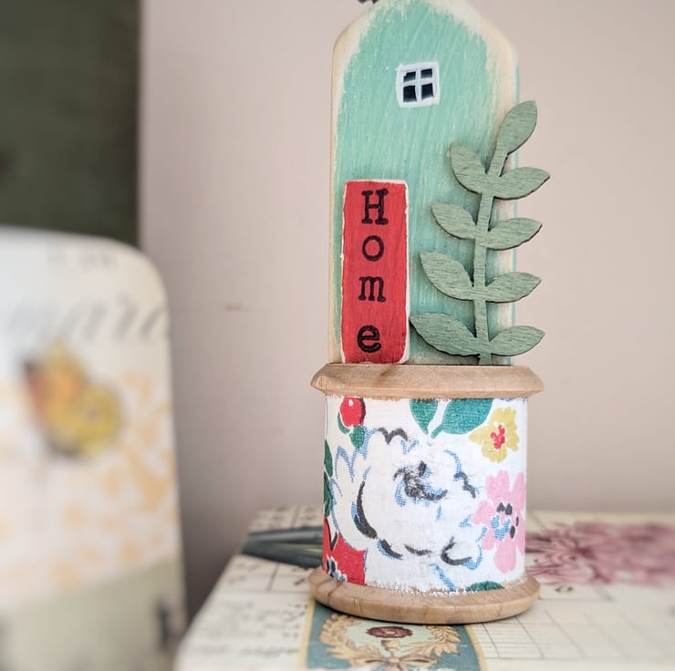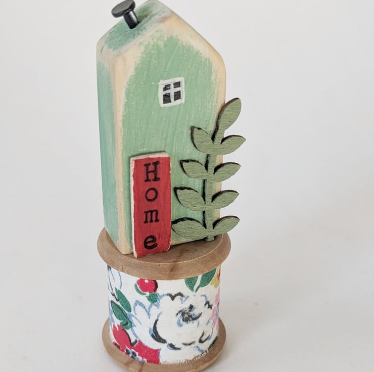 A hand painted little wooden house sits happily on a pretty vintage wooden bobbin.