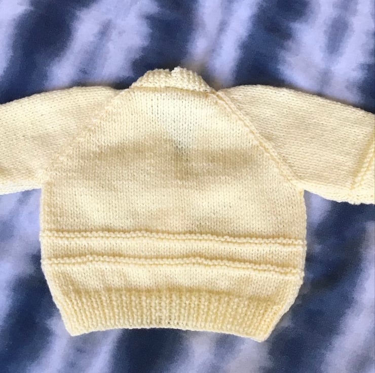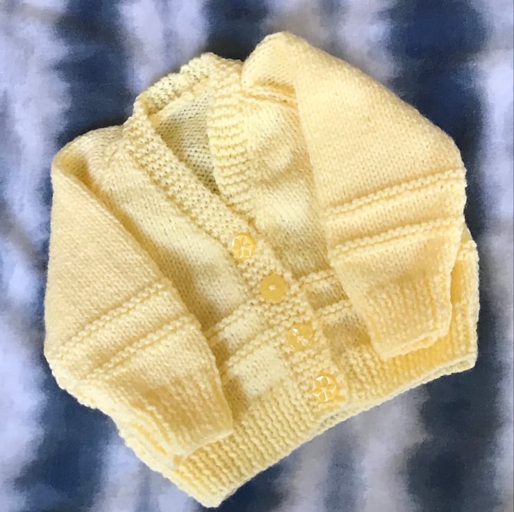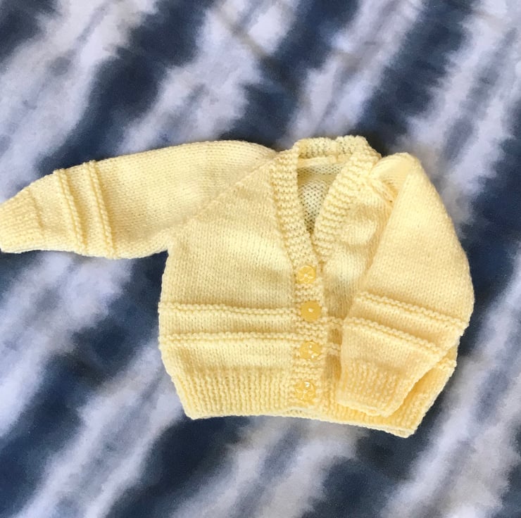 Very sweet little baby cardigan designed and hand knitted by me in my smoke and pet free suffering home. I have used a good quality acrylic baby yarn in a lovely lemon shade to make this soft little cardigan that fastens with four matching baby buttons. Would make a perfect gift for a spring or summer baby. Made to fit a little one from birth to three months approximately. Actual garment measurements are,
