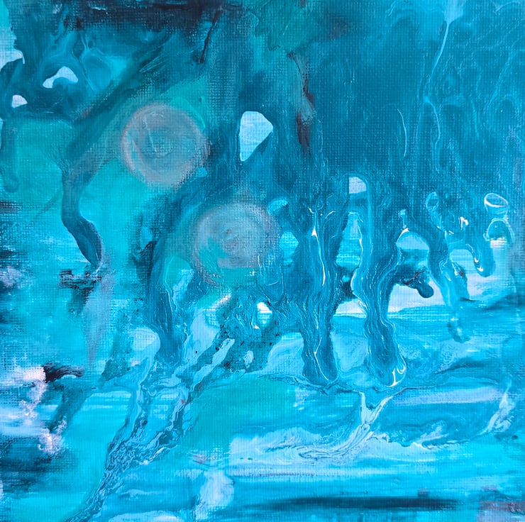Beside it, the turquoise canvas channels Uranus: cool, enigmatic, and quietly radiant. Its teal tones, drifting textures, and subtle luminosity mirror the planet’s icy atmosphere and tilted, unconventional presence in the solar system.