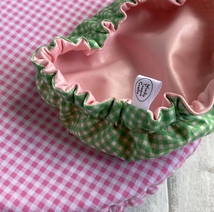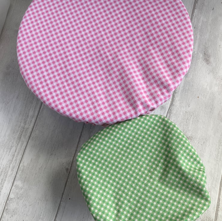 This set of 2 covers will fit bowls approximately 23cm and 16cm (9"and 6"). As you can see from the photos - they adapt to different shapes and don't only suit round bowls. They are made from 2 co-ordinating fabrics. The large one is pink and white check. The small one is green and white check. They are both lined with pink food-safe PUL