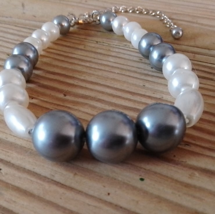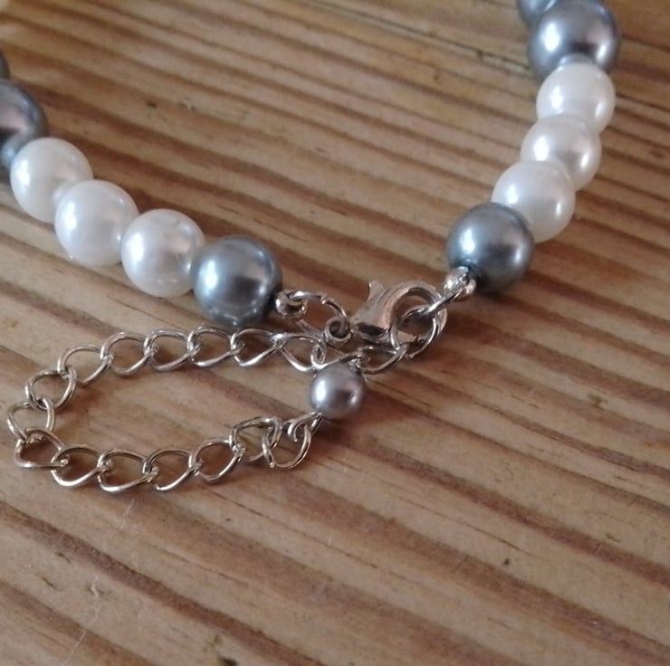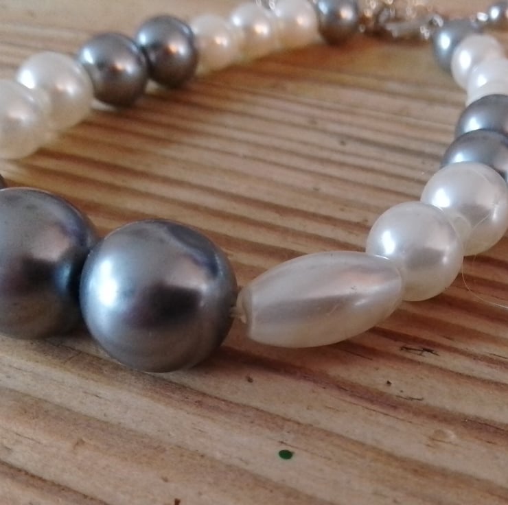 This handmade bracelet is made using pearl and resin beads in a grey and white colourway.
