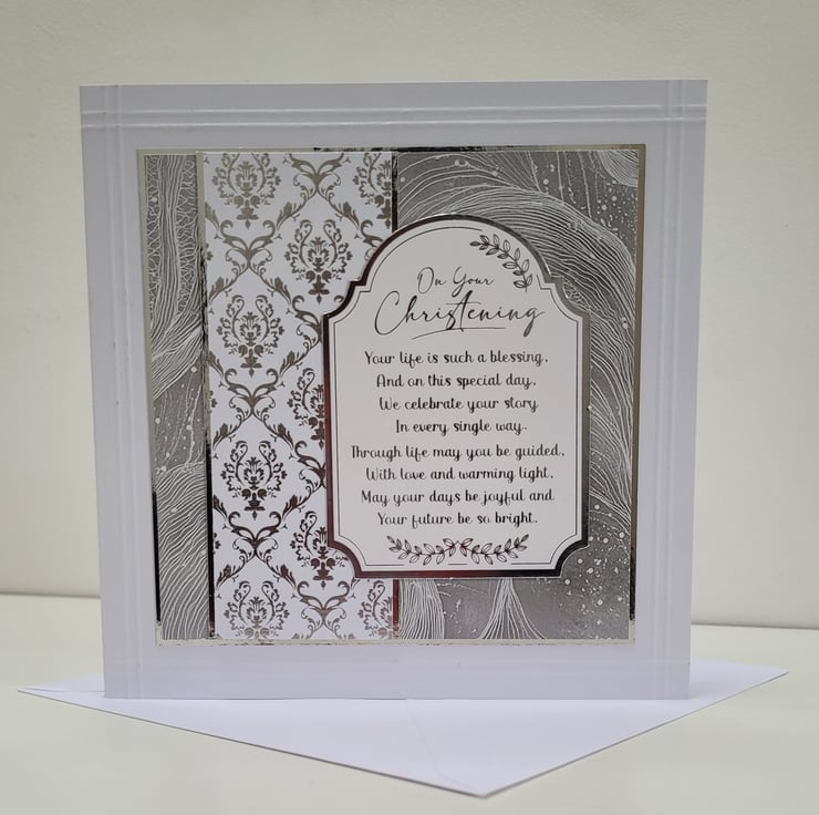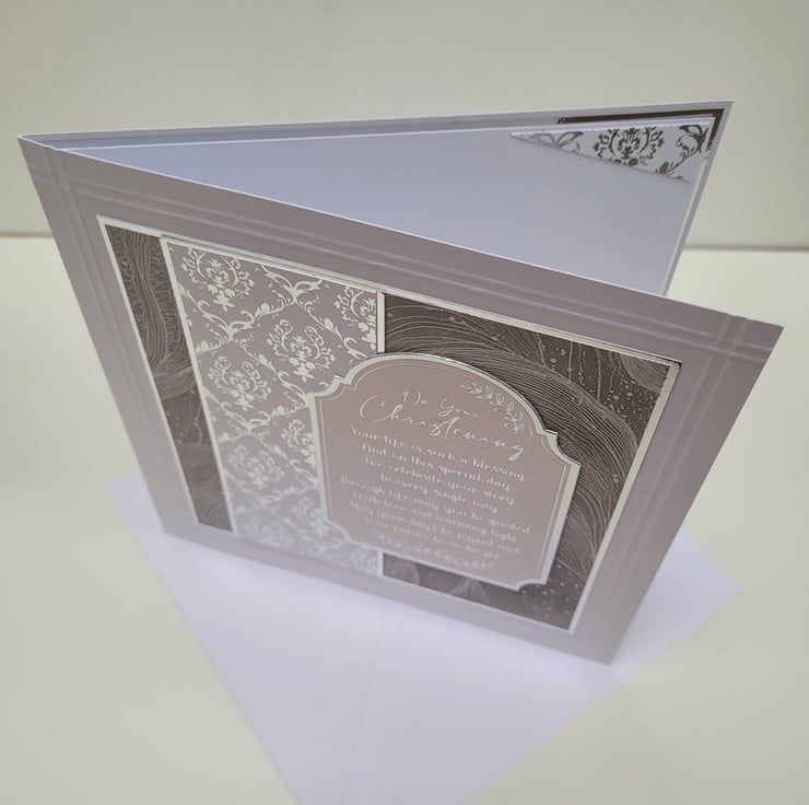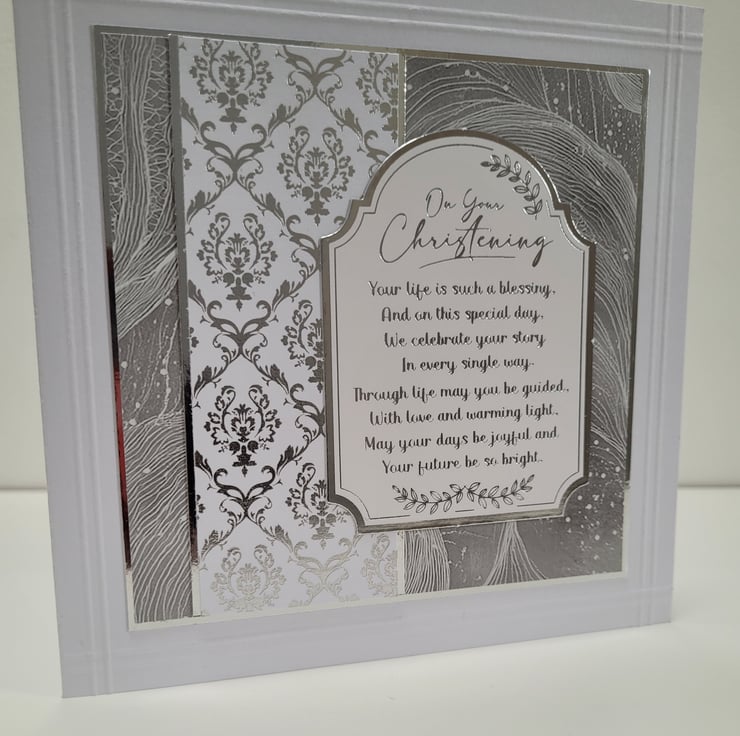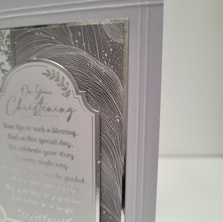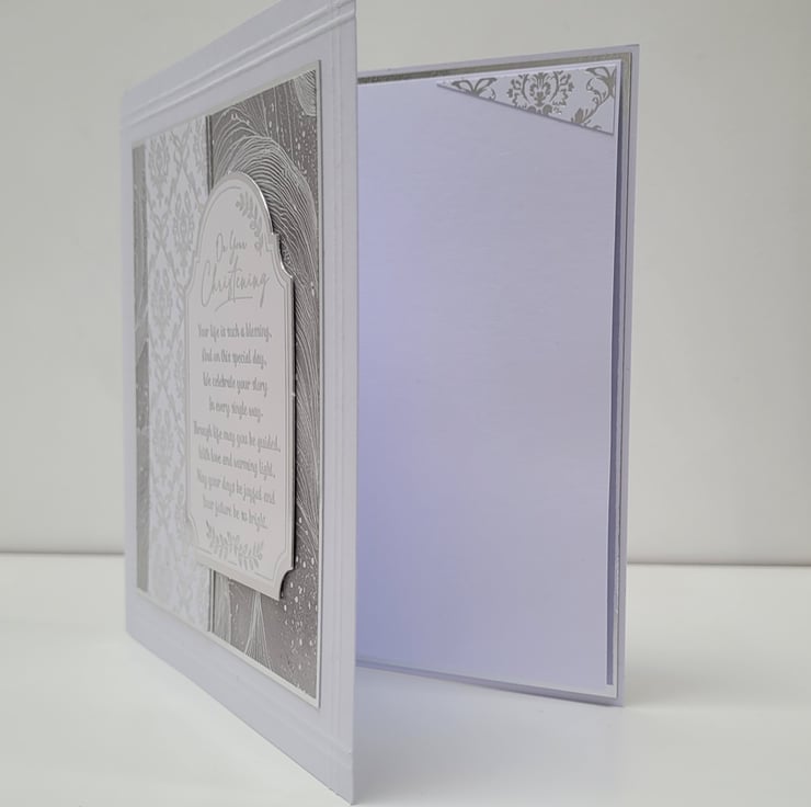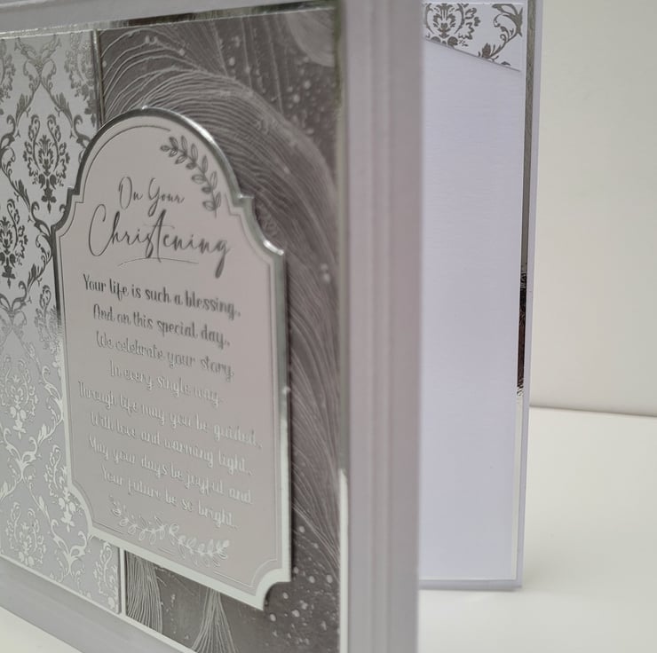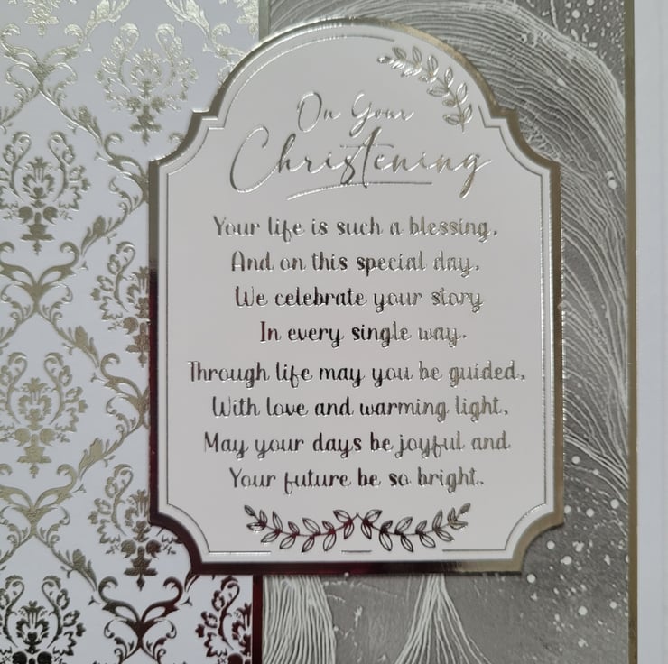 Celebrate a precious milestone with this beautifully handcrafted christening card, designed in a simple yet beautiful white and grey colour scheme. Featuring layered details, delicate patterns, raised embossing detail and a heartfelt poem, this luxury card is perfect for marking a baby's special day.