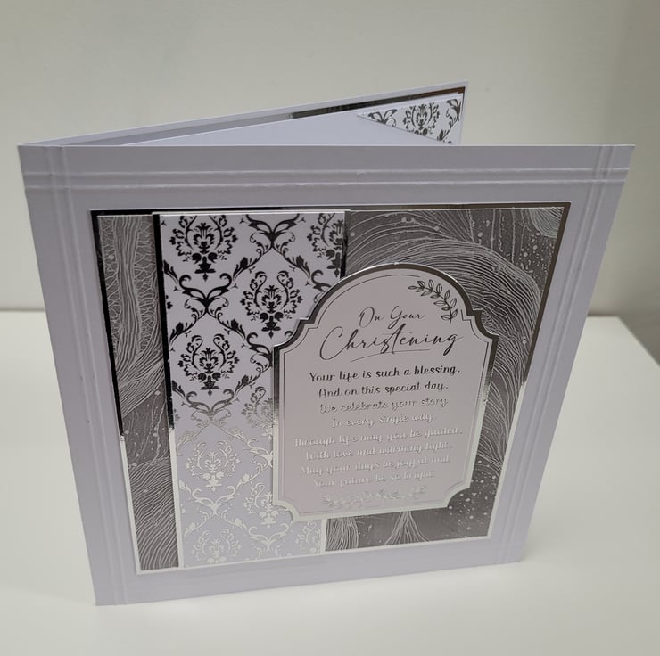 This is not just a unique handcrafted card - it’s a keepsake to treasure for years to come. Finished with metallic silver accents and ornate detailing, this card adds a touch of sophistication to any baptism or christening celebration.