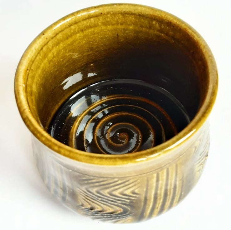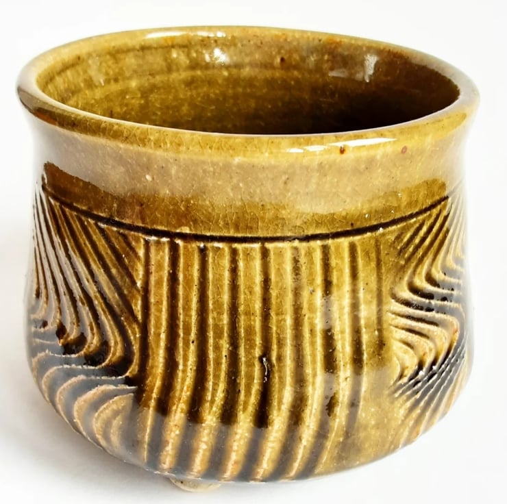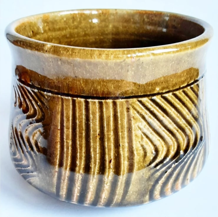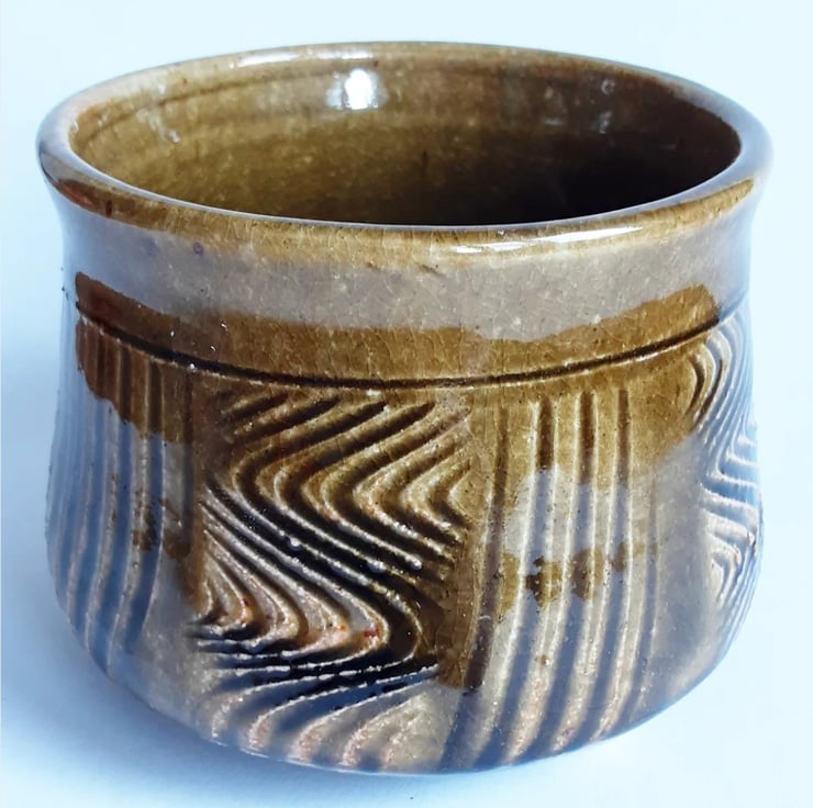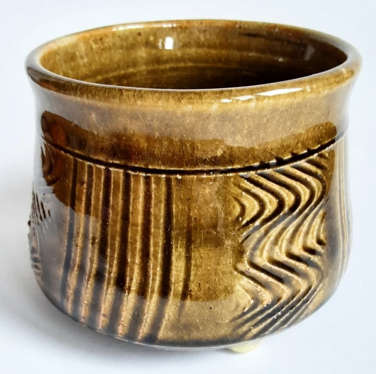 Glazed in brown glaze on the outside and inside. It has a pattern inscribed around the outside