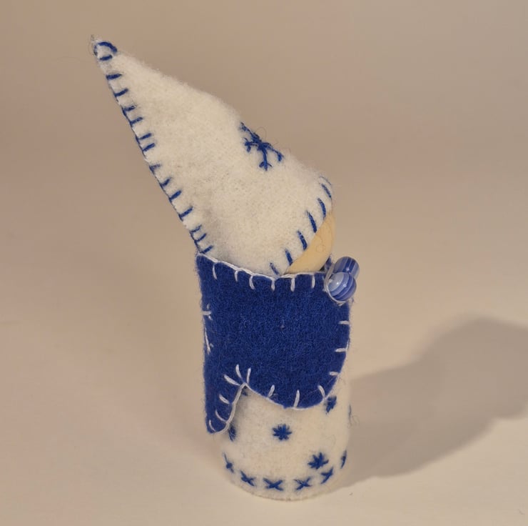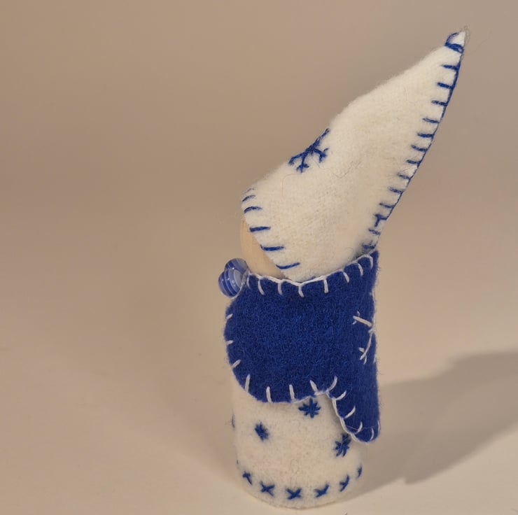 Beautifully handcrafted large wood and wool felt gnome, perfect for the winter nature table, dolls house & imaginative play, or as seasonal decoration in the home. All hand stitched, the white body and hat have blue decorative detail, including a snowflake and star, while the blue cape has a white star and blue & white beads. It stands at 9.7cm tall, including the hat