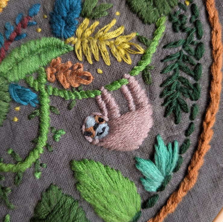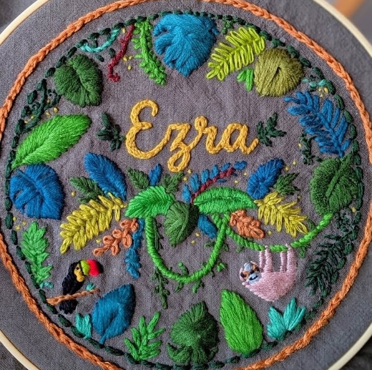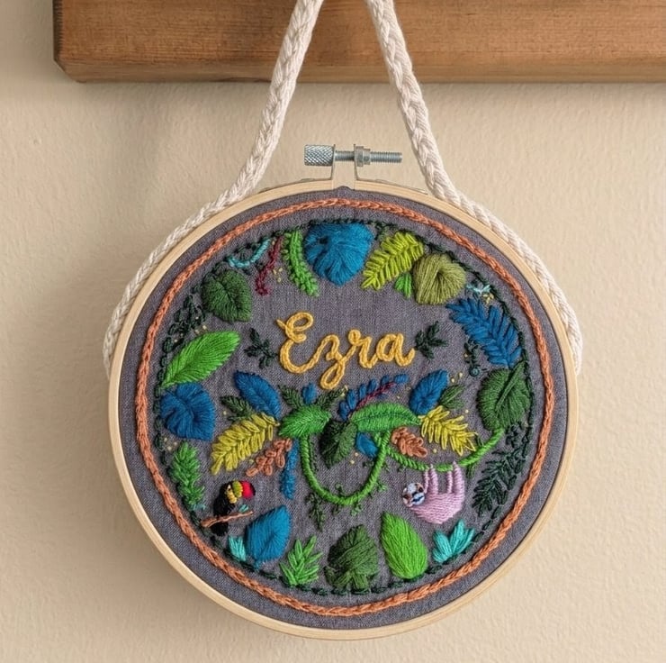 From the sleepy sloth hanging on a vine to the bright beak of a hidden toucan, every detail is layered with high-quality embroidery floss on a durable fabric backing. Whether you’re finishing off a nursery or looking for the ultimate "wow" gift for a baby shower, this personalised piece is designed to be a special heirloom.