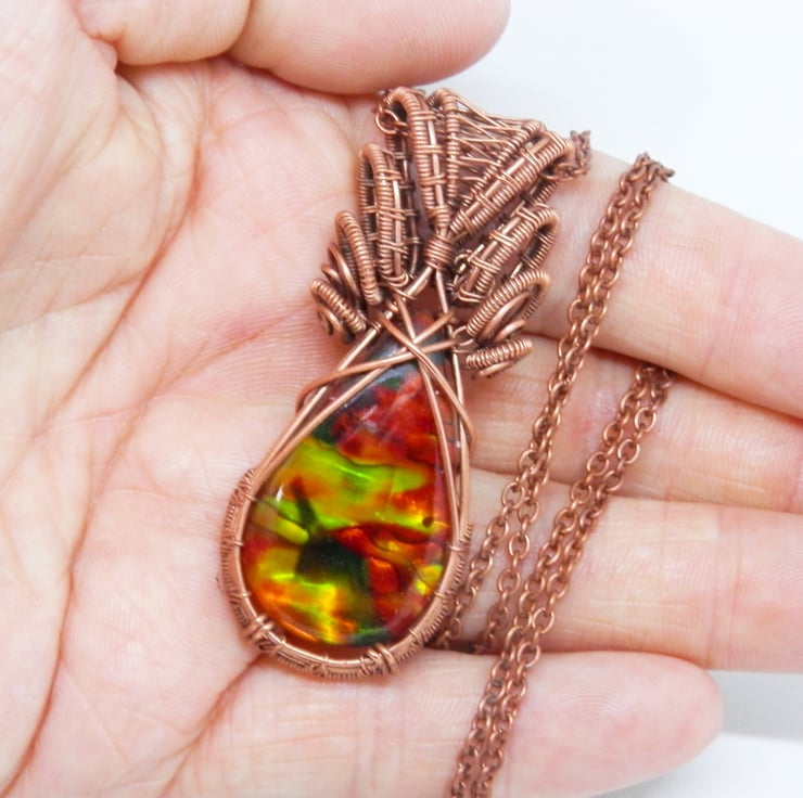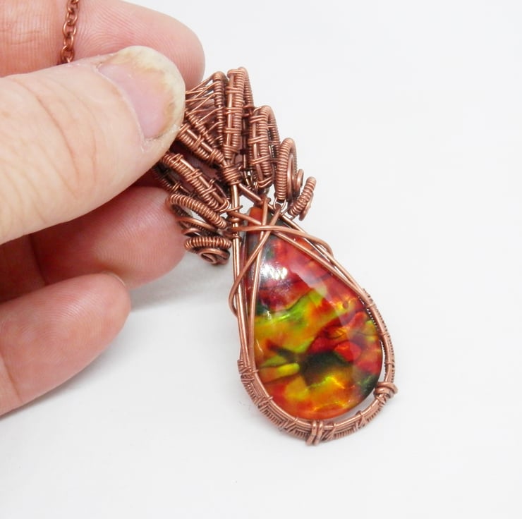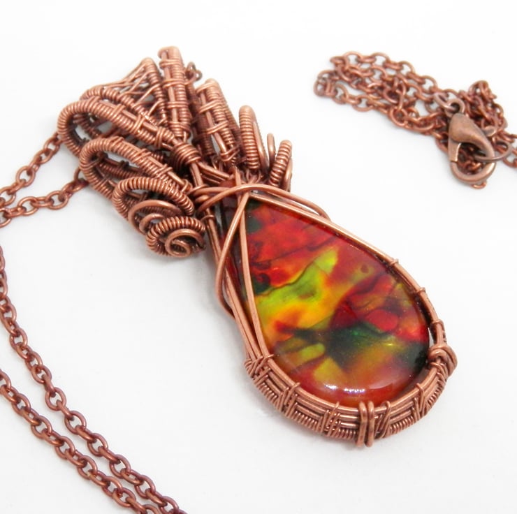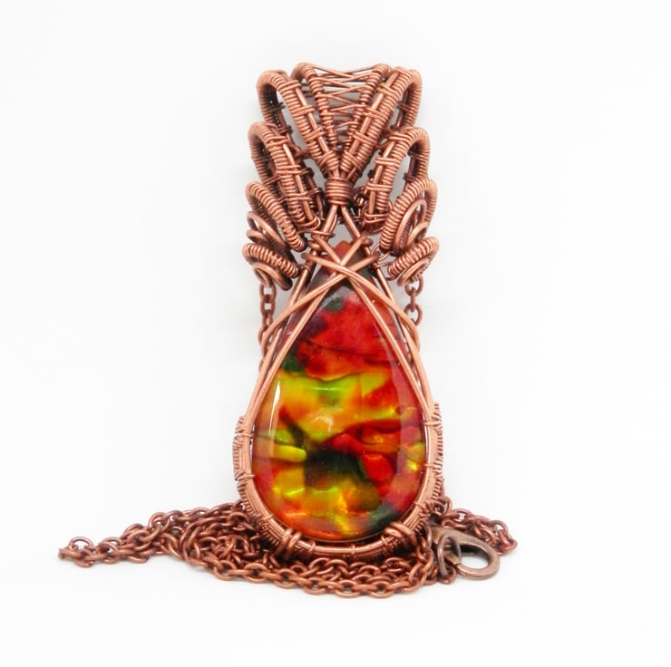 This is a beautiful wire wrapped Necklace, made using copper wire that has been wrapped lovingly in a Celtic style around a fabulous piece of Dichroic Glass. I have added lots of swirls and a fancy bail.