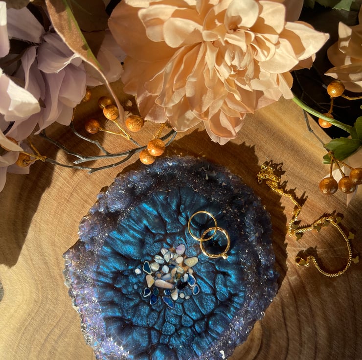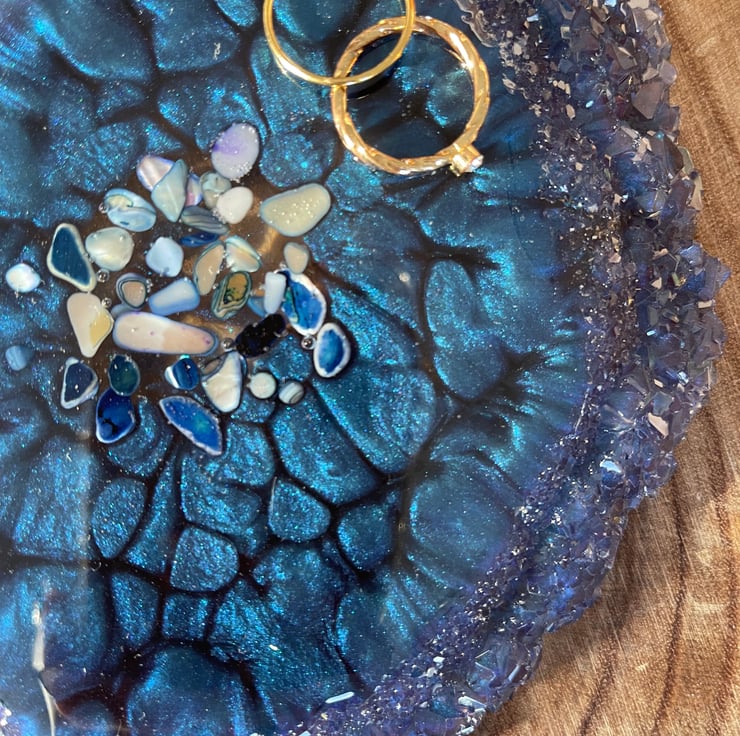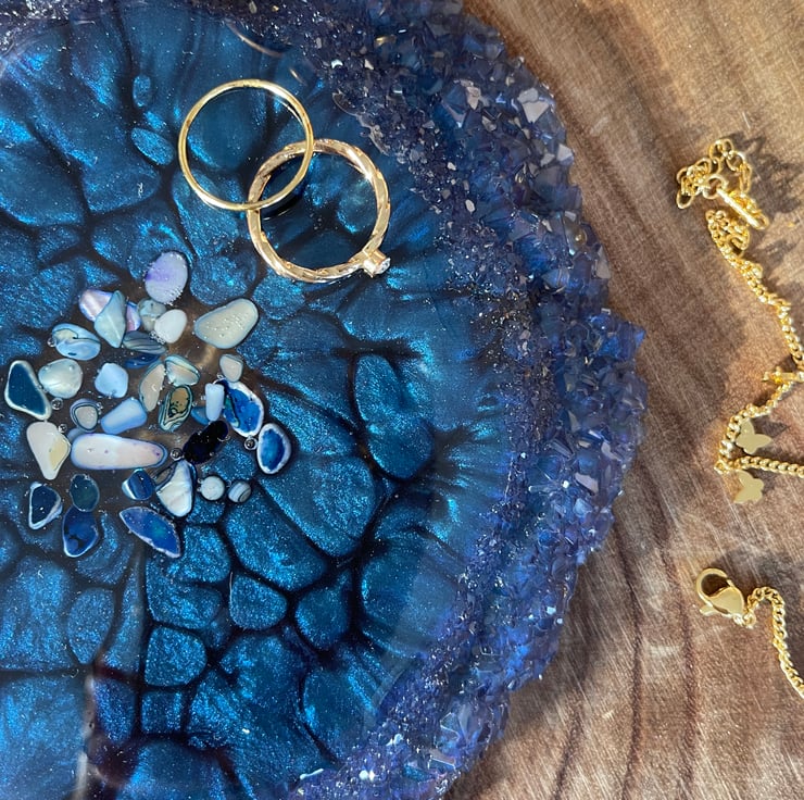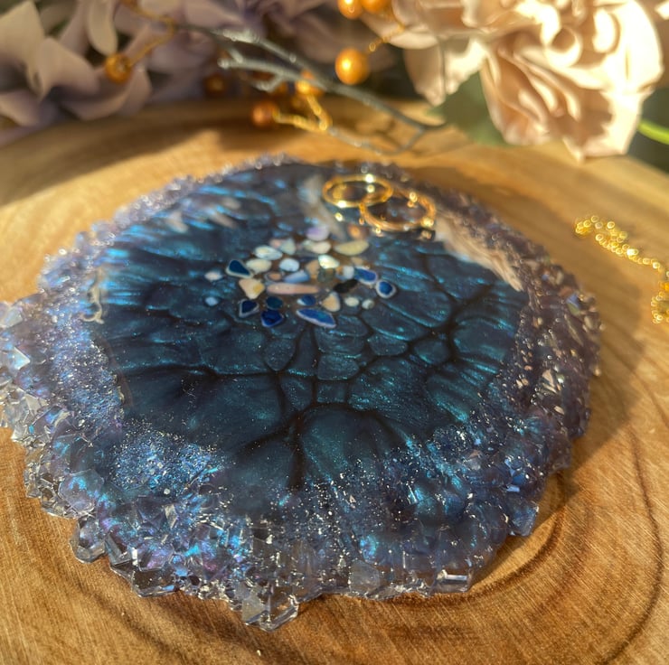 This navy resin coaster is handcrafted with care, featuring matching navy crystals embedded in the centre. The subtle navy pigments in the resin give it a deep elegant hue. The combination of resin and crystals adds a luxurious and sophisticated feel.