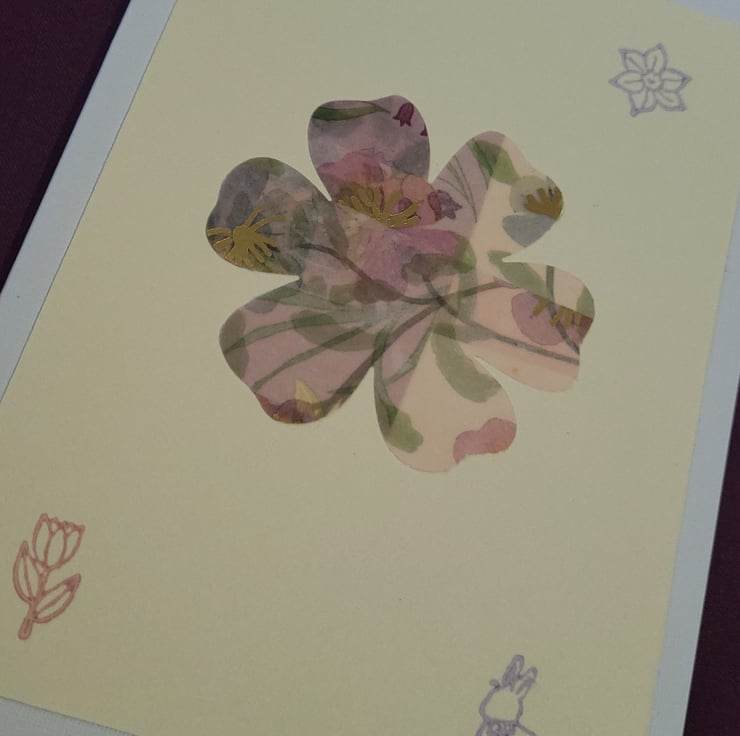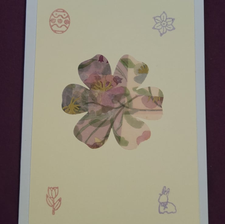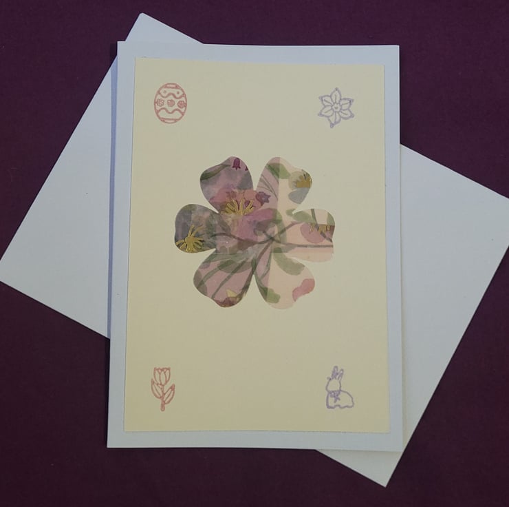Springtime handmade blank card glossy tissue paper design mounted on a pastel yellow card, onto an A6 white card. With ink stamps of spring flowers and easter designs.