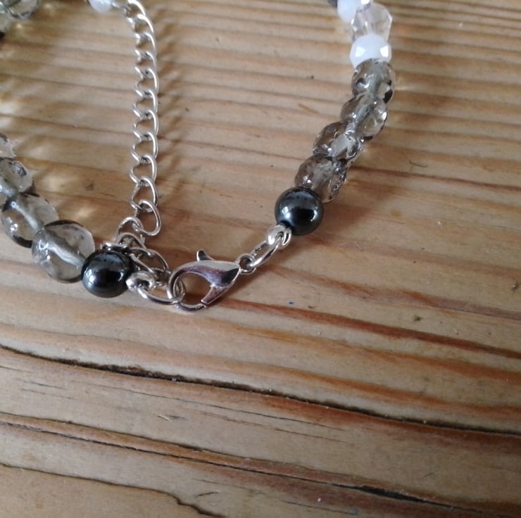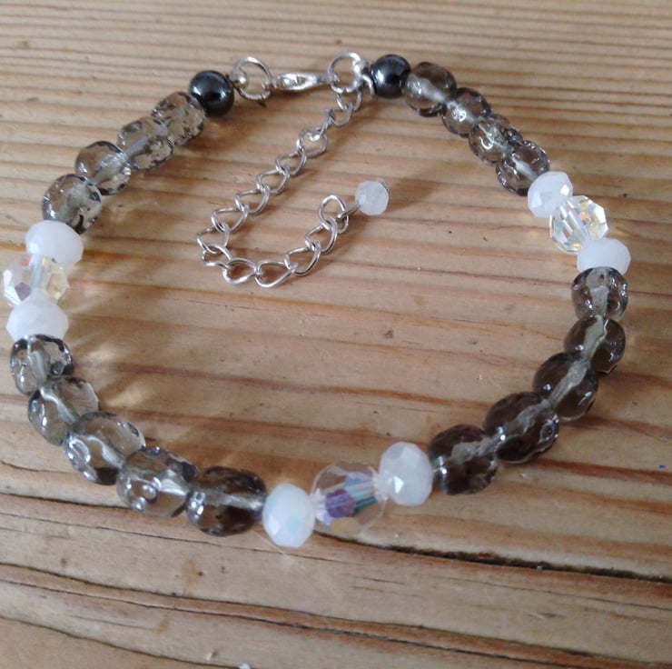 This handmade bracelet is made from a combination of faceted and shaped resin beads and haematite beads. The use of various materials and colours makes for a unique yet versatile piece of jewellery