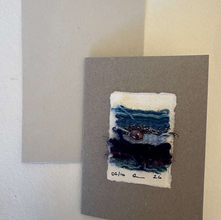The weaving is on an A8 sized piece of khadi paper and mounted on A6 card made of recycled paper with an envelope included