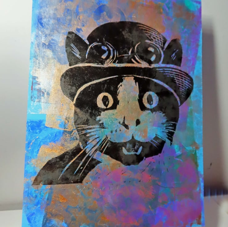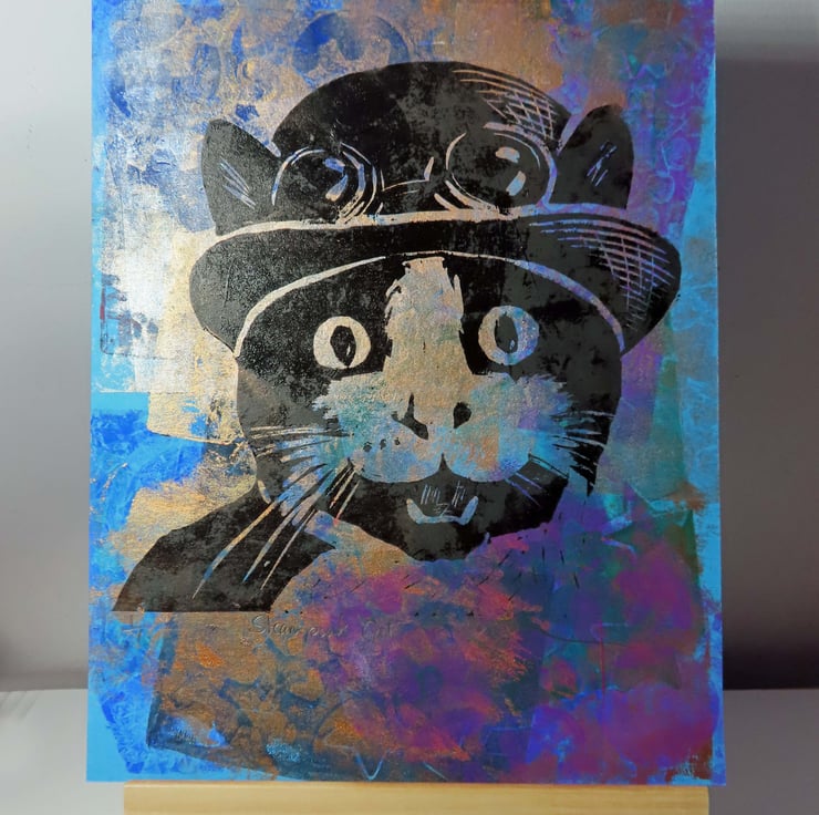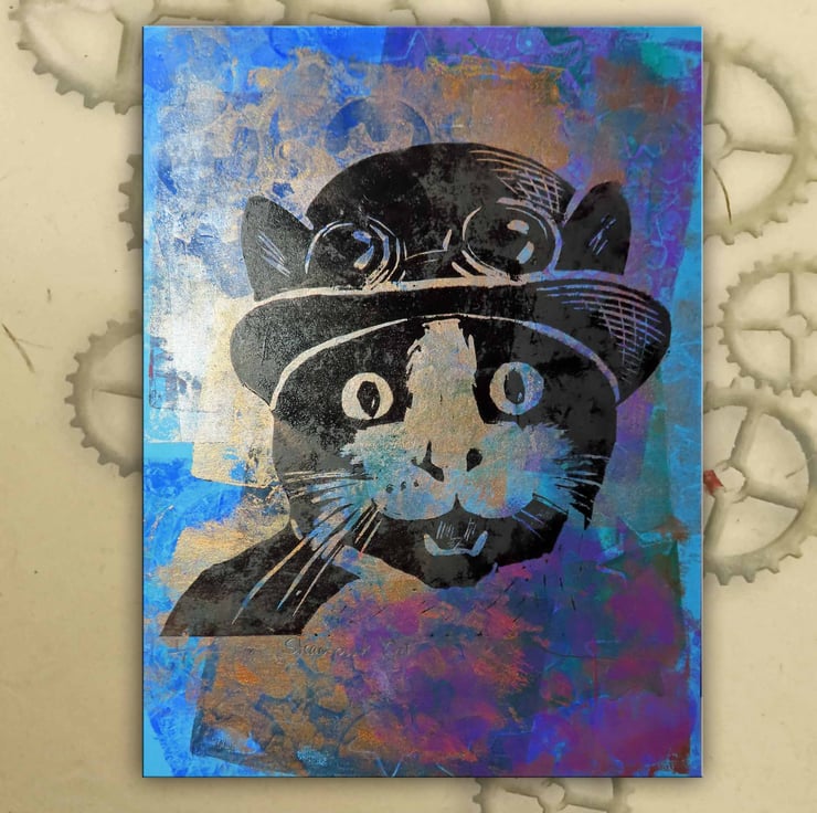 This is a very dapper cat in his Steampunk bowler hat and goggles!