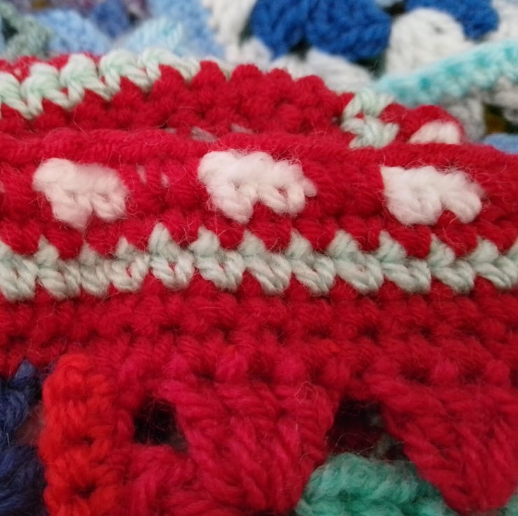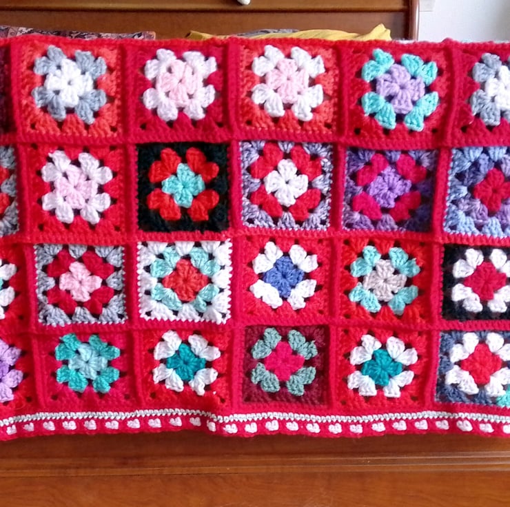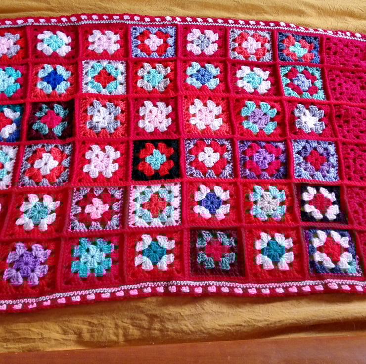 This blanket was made from a selection of yarn remnants with the primary colour being red.