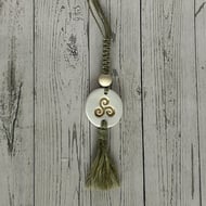 A small piece of quiet folklore for your home, car or sacred space. Each talisman carries the ancient triskelion symbol, a motif of harmony, movement and life’s turning cycles - hand stamped into natural clay and finished with a macramé cord and wooden bead. Choose from a round disc or cat head shape, in plain clay or with soft gold highlights.