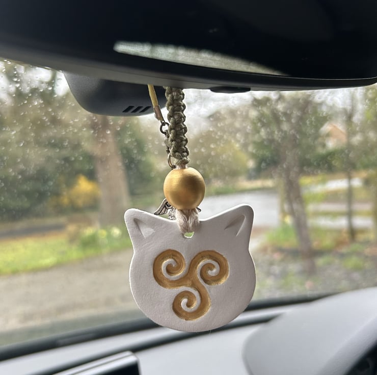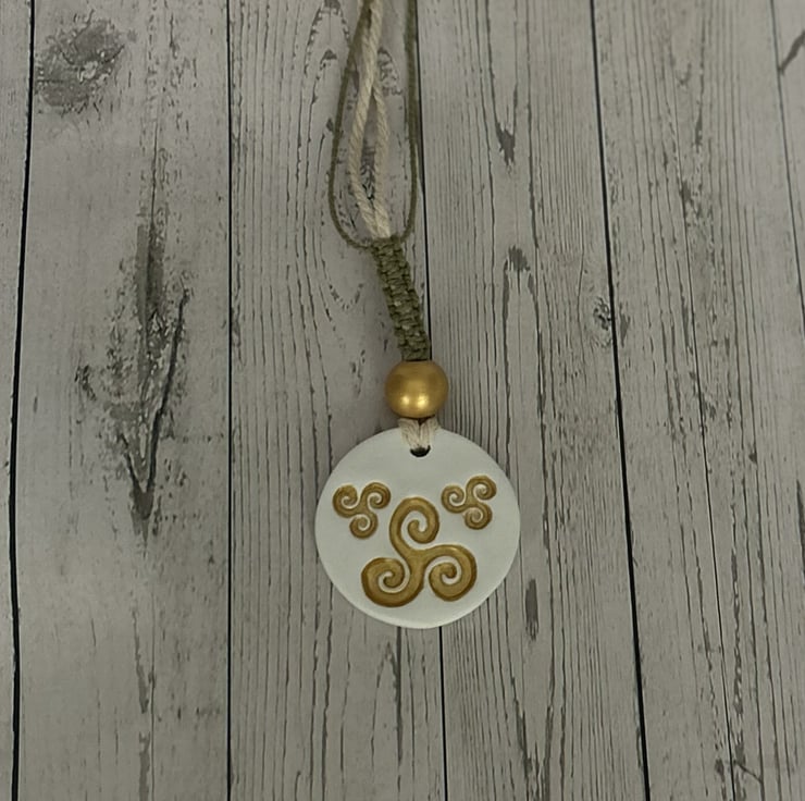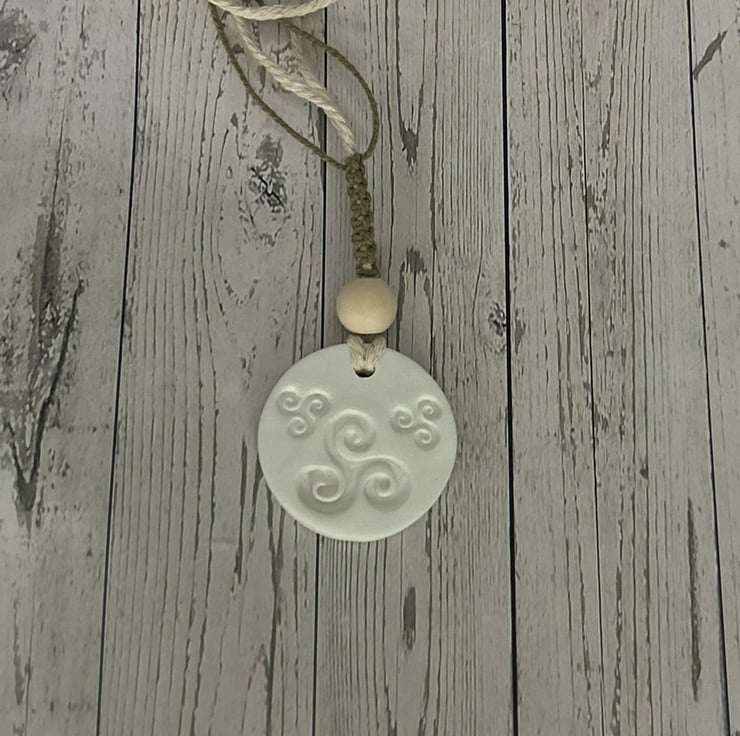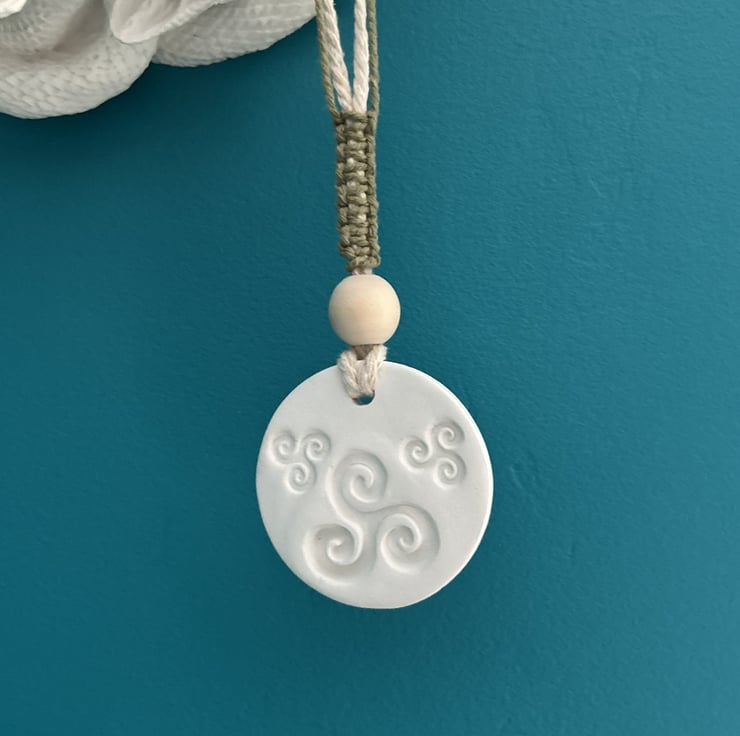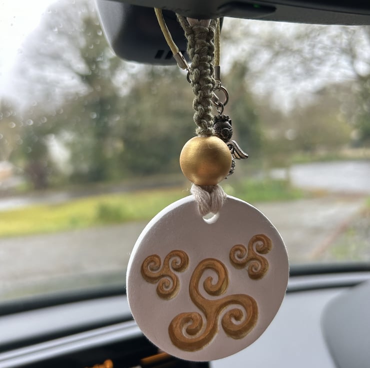 Handcrafted Celtic triskelion clay diffuser talisman for home, car, aromatherapy, spiritual décor and folklore inspired gifting.