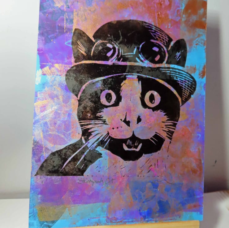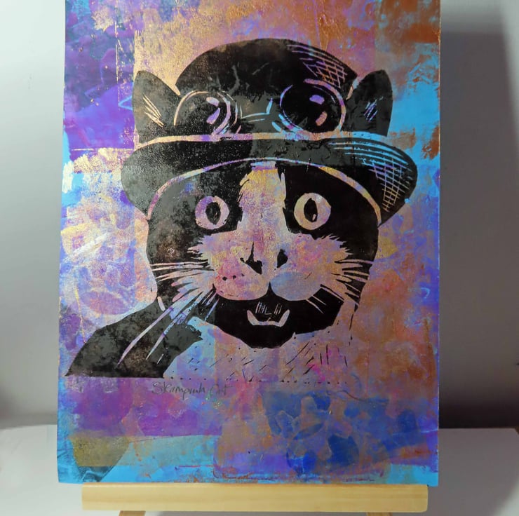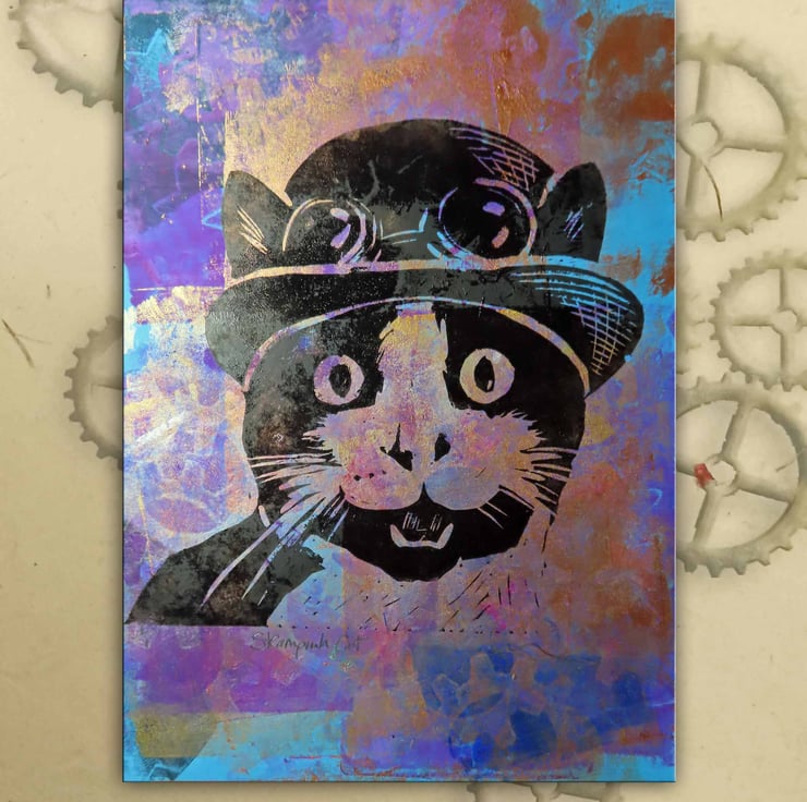 This is a very dapper cat in his Steampunk bowler hat and goggles!