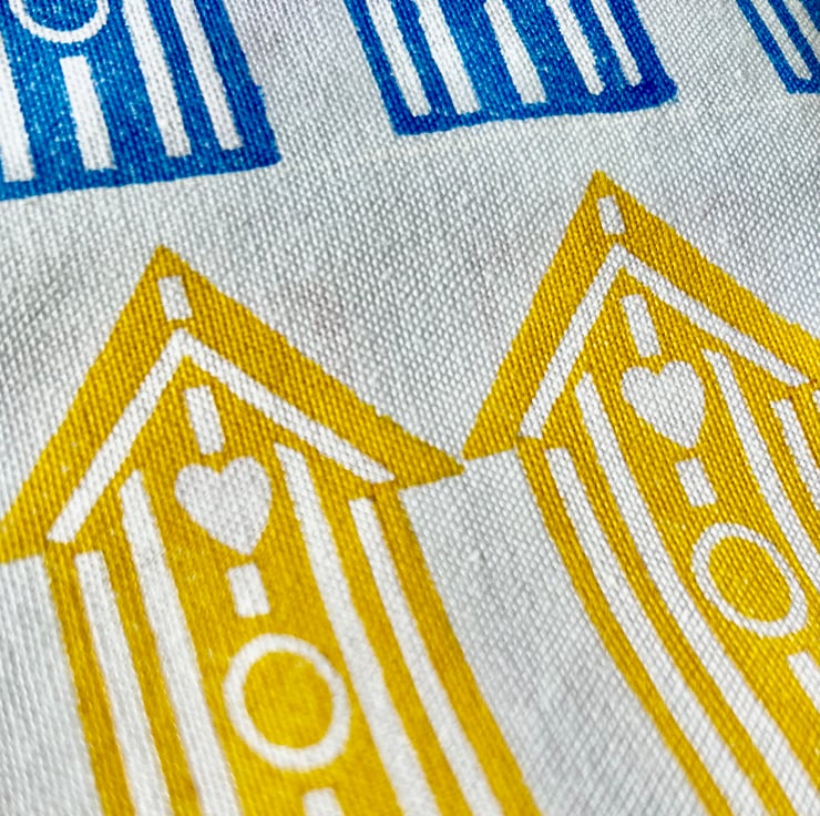 Multicoloured beach huts block printed onto a crisp white 100% cotton tea towel.