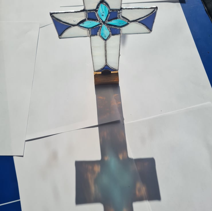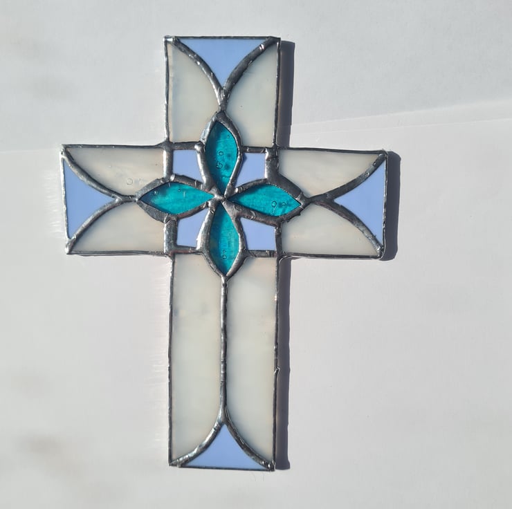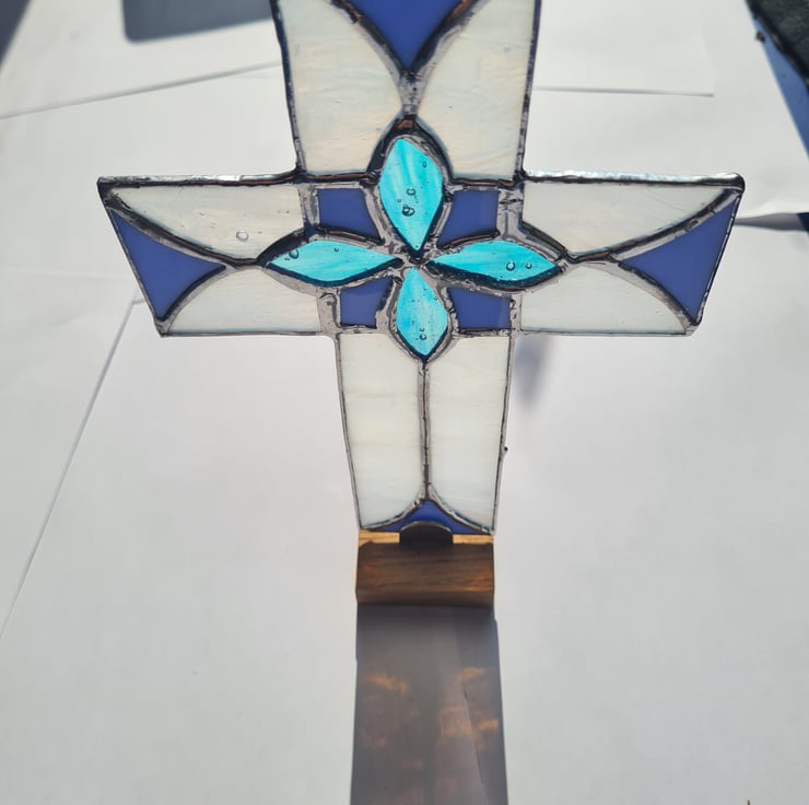 Here we have this stunning Easter Cross in complementing spring time colours, combined with an elegant yet simple design. Made using the Tiffany method, where each piece of glass is hand cut, shaped and wrapped in a copper foil before being soldered together, this piece measures 15x20cm, is made to last and will enchant you for years to come. Hanger included.