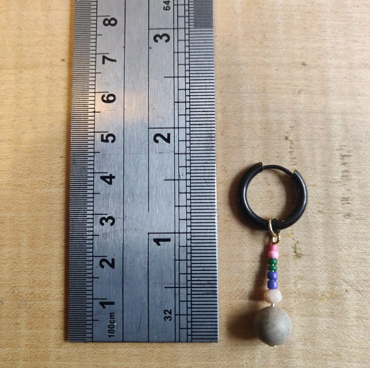 Length: approximately 4 cm from gemstone bead to top of the black stainless steel hoop. The hoop itself is 16 mm in diameter.
