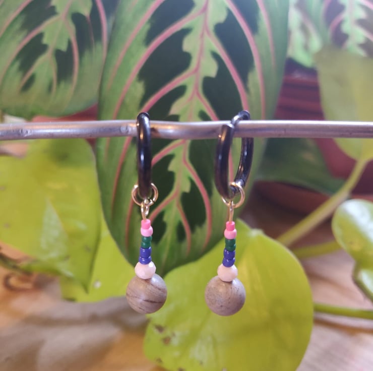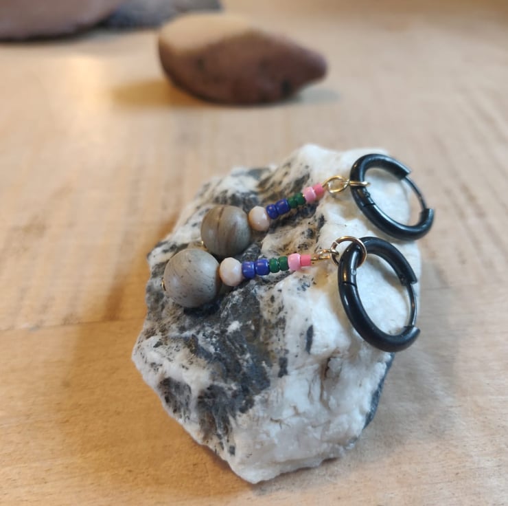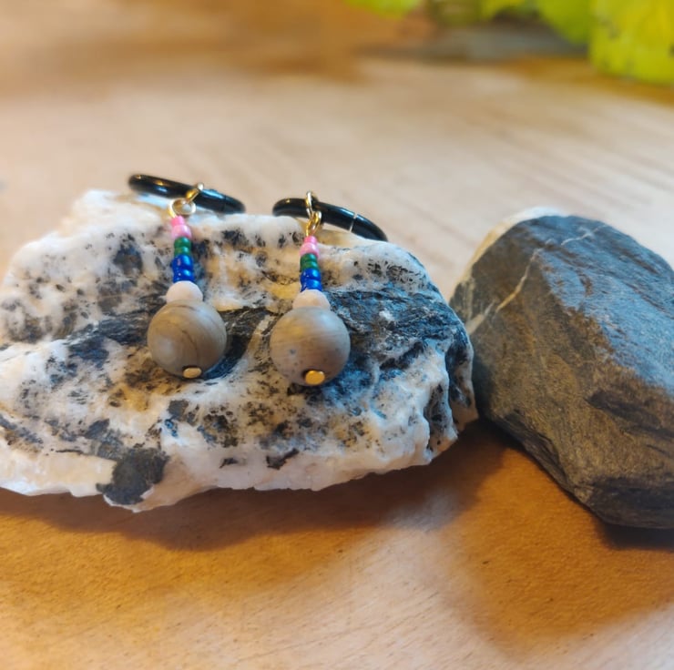 These pink, green, blue, peach and light-grey bead earrings are handmade by me, using both Czech and Miyuki glass beads. The gemstone bead at the bottom is made of frosted silver leaf jasper.