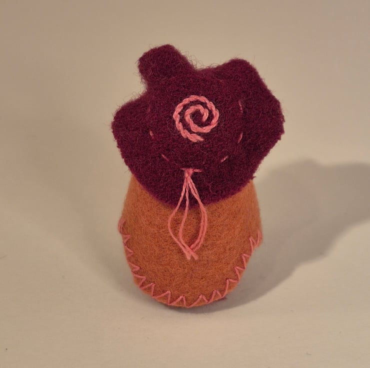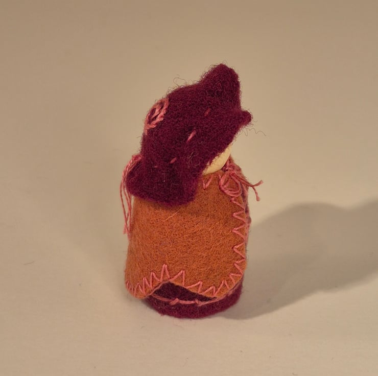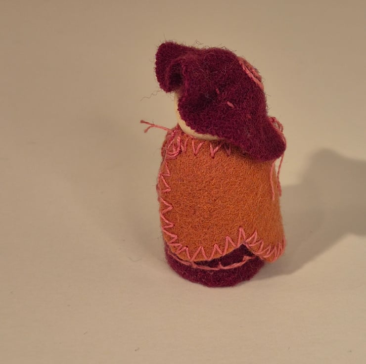 Beautifully handcrafted small wood and wool felt gnome, perfect for the nature table, doll's house & imaginative play, or as seasonal decoration in the home. All hand stitched, there is detail on the body, cape and cap It stands at 4.6cm tall, including the hat