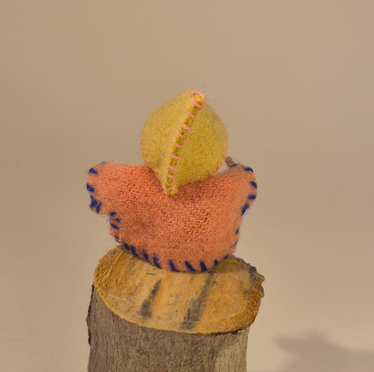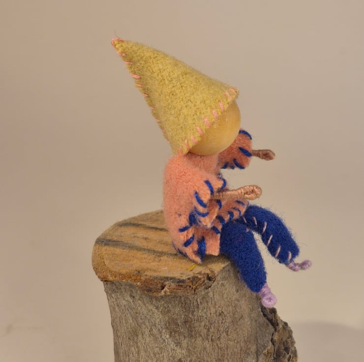 This cute little gnome has a wire body, which makes them bendable. They have been handcrafted from felt, wire and wooden beads, perfect for the spring nature table, doll's house & imaginative play, or as seasonal decoration in the home. All hand stitched, they have a pink top with blue edging, and blue trousers with pink edging, and a beige hat with pink edging. Their hands and feet are wire covered lilac embroidery floss. They are 7.5cm long, including the hat