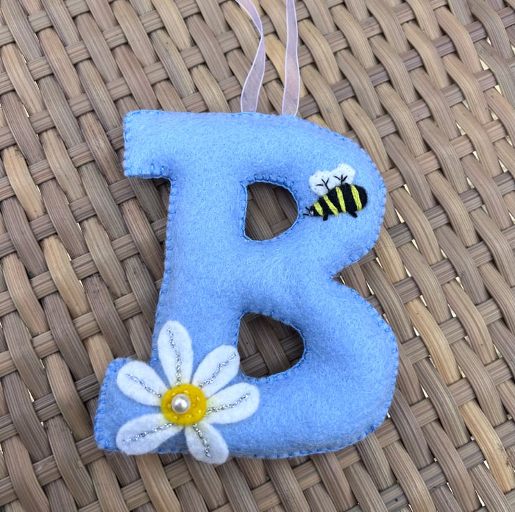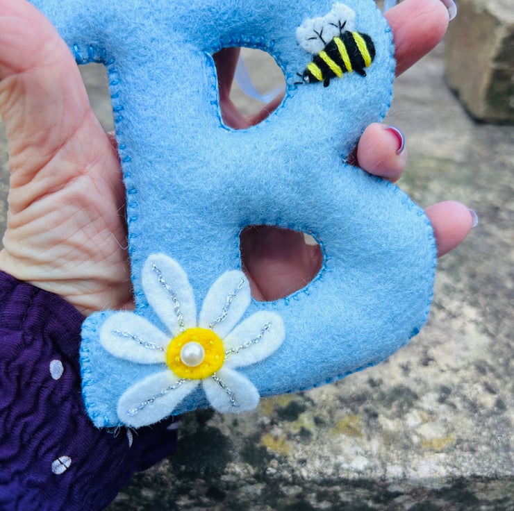 A beautiful hand cut and hand sewn padded felt letter with bee and daisy embellishment approx 11 cms tall