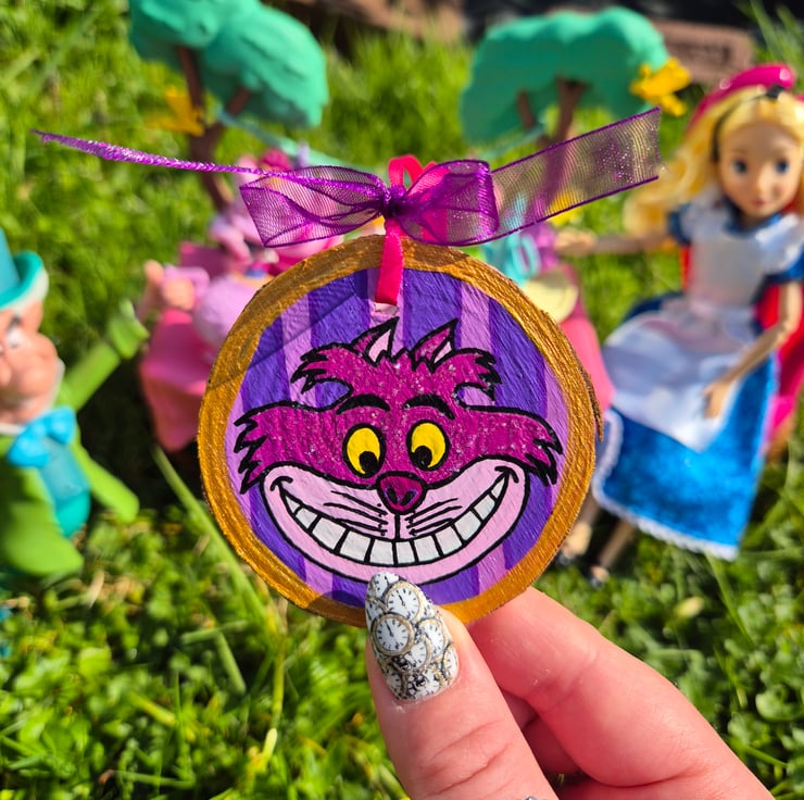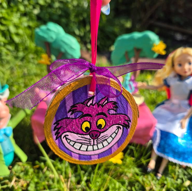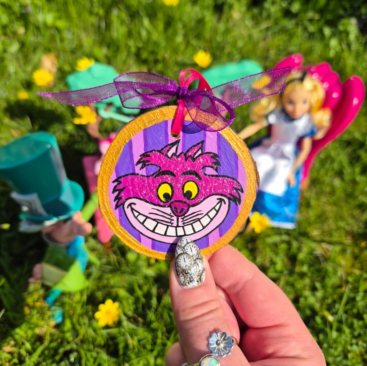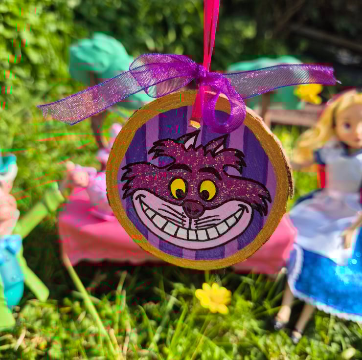 Cheshire Cat Hand Painted Wood Slice Decoration