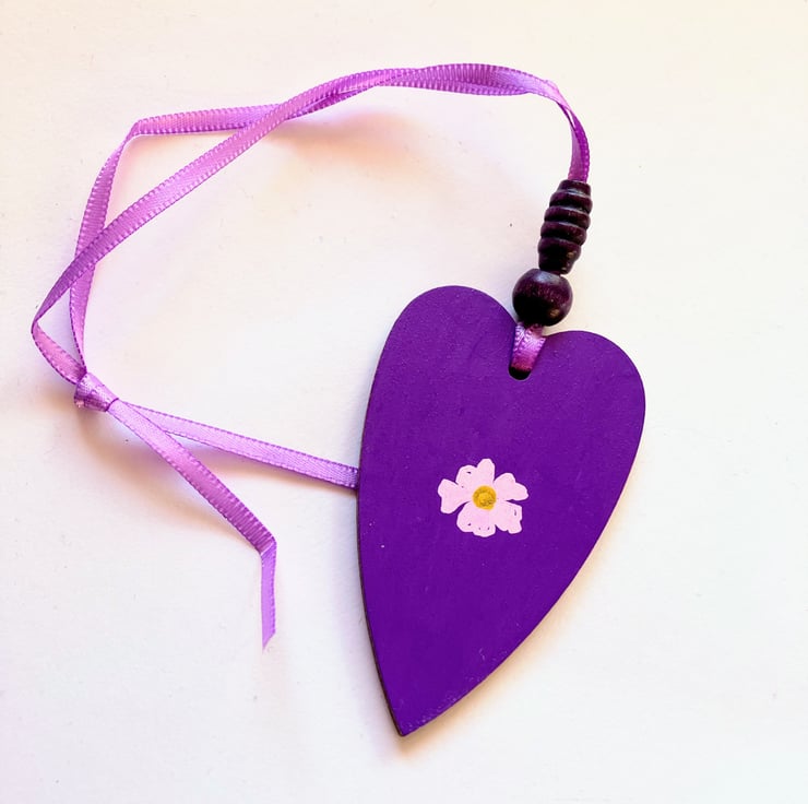 The other side has a single pink flower. A purple satin ribbon with 2 purple wooden beads hangs this pretty heart.